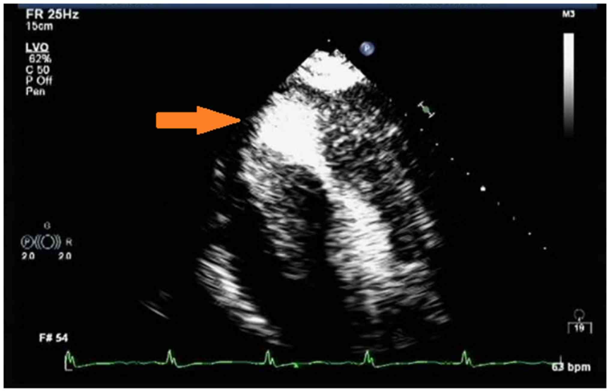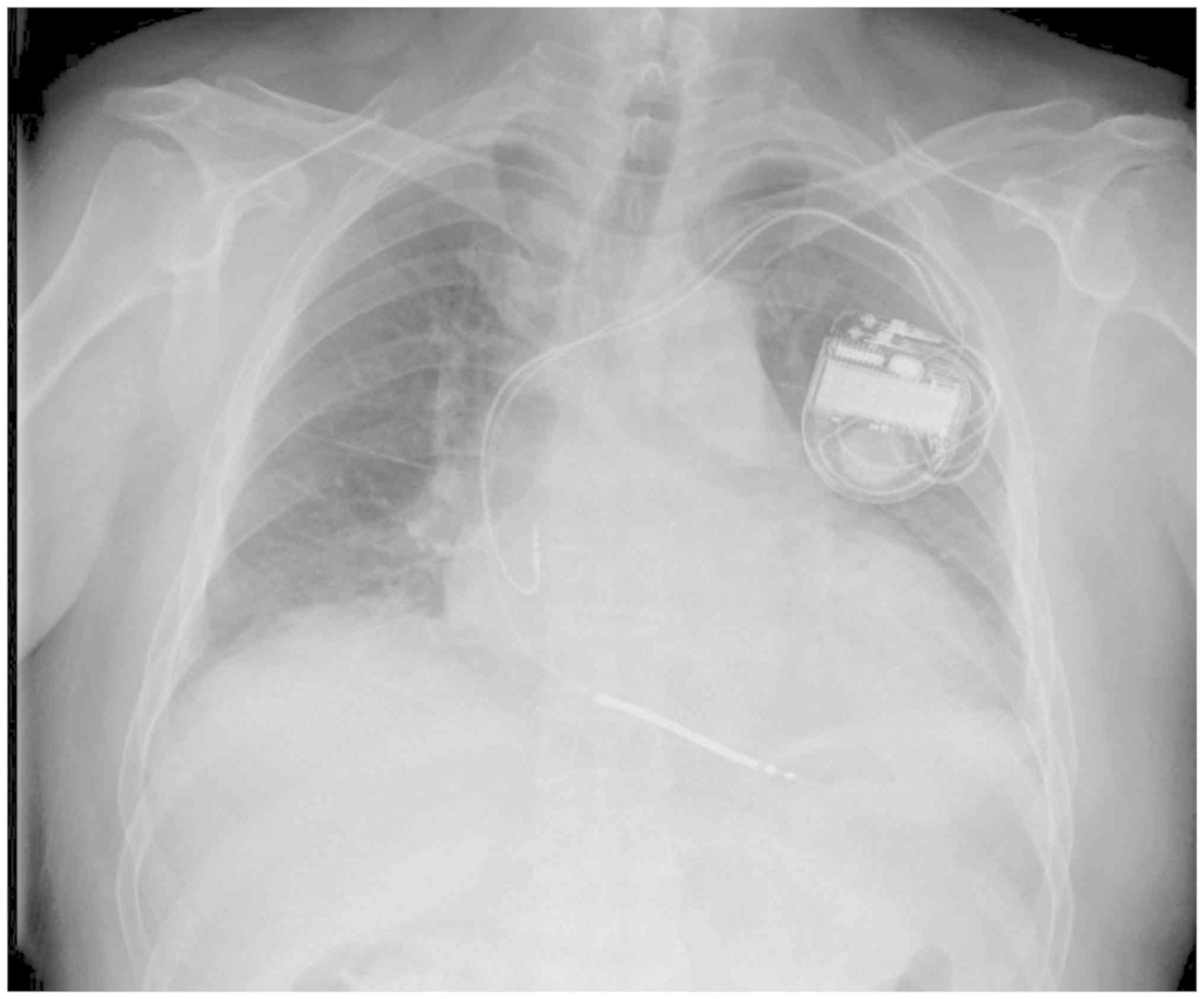 After 10 days, the patient was transferred to the Department of Cardiology of West China Hospital (Chengdu, China). The electrocardiogram revealed sinus rhythm, ST elevation (≥1 mm) and T wave abnormality in V2 through V6 (negative T waves). Stabilization of the patient was obtained after electric cardioversion and concomitant use of β-blockers and amiodarone. Coronary angiograms indicated no narrowing of any major epicardial coronary arteries. Transthoracic echocardiography revealed normal dimensions of the LV (48 mm) with mid-cavity hypertrophy (maximal wall thickness in the interventricular septum, 25 mm), left atrial dilatation (39 mm), a measured ejection fraction of 62% and an aneurysmal apex (Fig. 3). A subsequent cardiac acoustic contrast demonstrated clear evidence of HCM with an hourglass shape of the LV and a 35×32 mm apical aneurysm (Fig. 4). The patient then underwent dual chamber implantable cardioverter defibrillator (ICD) implantation for prevention of fatal ventricular arrhythmias (Fig. 5). Subsequently, the patient remained clinically and hemodynamically stable.