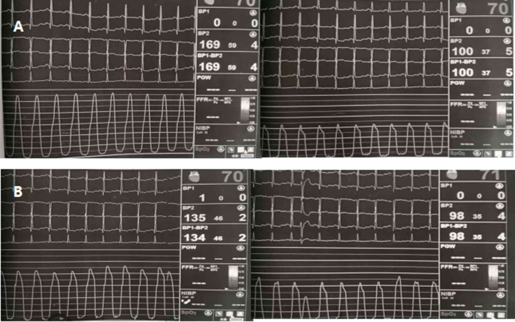 One year later, the patient experienced an electrical storm with 100 episodes of sustained ventricular tachycardia (VT) and multiple ICD shock (Fig. 6). Recurrent sustained monomorphic VT was terminated by increased doses of amiodarone and β-blocker. Furthermore, the patient experienced dyspnea on exertion. On transthoracic echocardiography, an apical aneurysm and a provoked mid-ventricular gradient of 64 mmHg were noted. The patient refused surgical treatment and but provided written informed consent to undergo alcohol septal ablation. Hemodynamic assessment revealed a significant intra-ventricular pressure gradient of 69 mmHg (LV apex, 169 mmHg; LV outflow, 100 mmHg; Fig. 7A). Repeated hemodynamic measurements after the procedure revealed a decrease of the post-extrasystolic gradient to 37 mmHg (LV apex, 135 mmHg; LV outflow, 98 mmHg) at the mid-ventricular level (Fig. 7B). The fourth and the fifth septal branches were dominant and echocontrast injection into target vessels resulted in the largest echocontrast view in the hypertrophic muscle segment. Therefore, the fourth and the fifth septal branches were assumed as target vessels and occlusion of these vessels resulted in a significant decrease in the intraventricular pressure gradient. The post-procedural echocardiographic examination indicated reductions in the left atrial dimension to 30 mm, intra-ventricular septum thickness to 20 mm and a mid-ventricular peak systolic gradient of 19 mmHg. There were no further VT episodes during treatment with amiodarone (200 mg, once a day) and metoprolol (47.5 mg, twice per day).