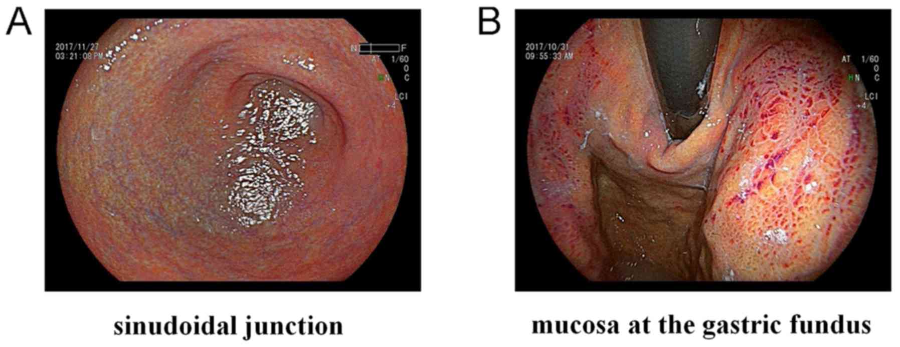 The exclusion criteria were as follows: i) Functional dyspepsia (ruled out using medical history and endoscopy); ii) gastric and duodenal ulcers (ruled out using endoscopy); iii) gastric cancer (ruled out using endoscopic and pathological examination); iv) pancreatic and biliary diseases (ruled out using abdominal doppler ultrasonography) and partial computerized tomography and magnetic resonance were excluded if necessary; v) serum liver function was measured in all patients and 8 patients were excluded due to hepatitis; (vi) age <25 years, age >79 years, pregnant or lactating women; vii) cardiac, pulmonary and neuropsychiatric disorders, patients which cannot tolerate gastroscopy or patients who disagree with endoscopy; and viii) patients who had received anticoagulant drugs in preceding 2 weeks, or patients who exhibited coagulation dysfunction (25).