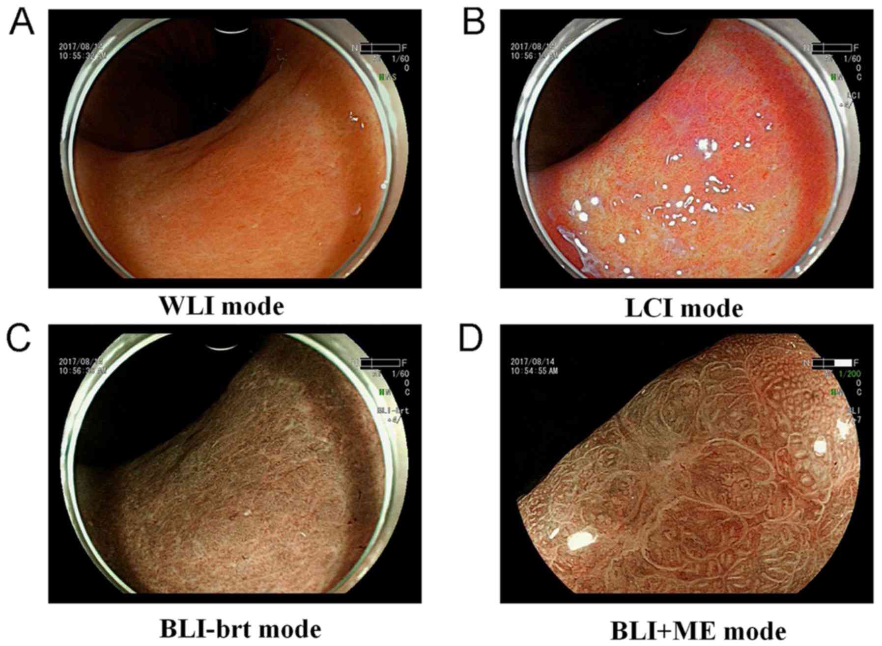 The current study is a prospective study. Patients were selected if they had undergone blue laser magnifying endoscopy from August 2017 to July 2018 in the outpatient department at the Shenzhen Hospital of Southern Medical University (Shenzhen, China). Endoscopy and pathological biopsy were used to diagnose CG in 120 patients (60 male and 60 female), aged 26–79 years old. Four modes were used to observe all patients, which were divided into four groups. The groups were as follows: i) white light group (control group); ii) Linked color imaging (LCI) group (observation 1 group); iii) BLI-bright (BLI-brt) group (observation 2 group) and the iv) BLI+ magnified imaging (ME) group (observation 3 group). The diagnostic criteria used were based on the ‘Consensus Opinion for Chronic Gastritis in China, 2012’ of the Chinese Medical Association Gastroenterology Section (23). Endoscopic classification and histological grading were performed in 120 patients (23). All participants in the current study signed written informed consent. The current study is in full compliance with the ethical standards established by The Human Body Testing Committee of China.