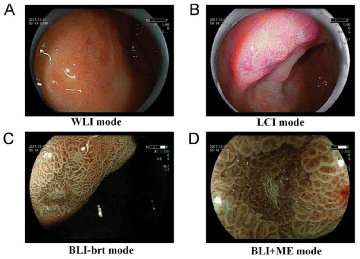 A representative image of a patient was selected in this study for observation (Fig. 3). The WLI, LCI, BLI-brt observation model showed that the lesions were slightly rough compared with the surrounding mucosa. The mucosa color appeared to be different in the different modes. However, in all cases, an obvious color difference was observed compared with the surrounding normal mucosa. Under the BLI + ME observation mode, regular MS pattern, gland shortening and a spiral blood vessel were observed between the fossa.