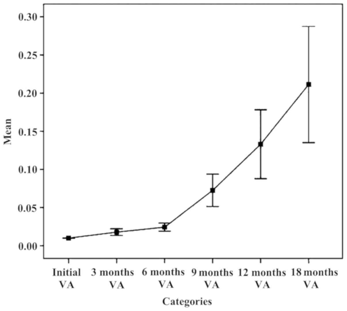 Central visual acuity was measured at baseline and then after one month, 2 months and 3 months. These data were obtained for all treated eyes (100% of cases). For some patients, VA follow-up could also be done after 6 months, 12 months and 18 months. Tailure to follow-up the medium controls (6–12/18 months) of patients was determined both by a lower compliance and by old age associated with other systemic diseases, which reduced the addressability to the ophthalmologist.