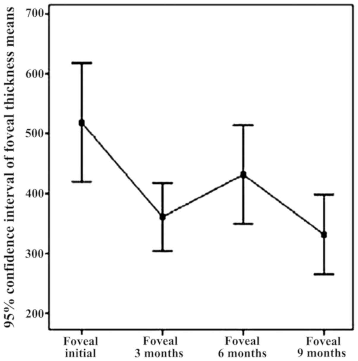 In Fig. 4, a decrease of central retinal thickness in the baseline range of 9 months under the effect of intravitreal bevacizumab injection can be noted.