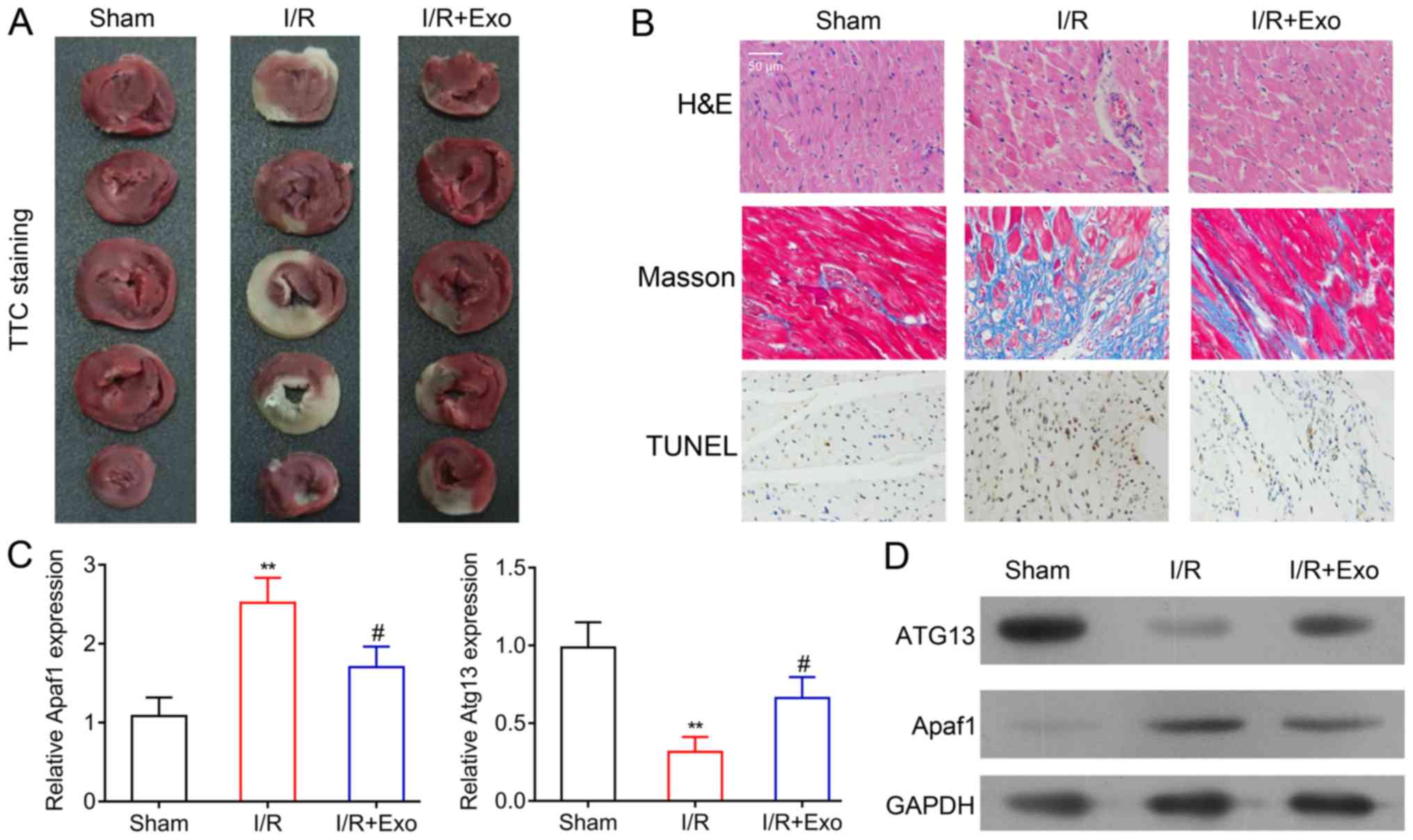 Furthermore, Apaf1 mRNA expression was increased in the myocardial tissues of I/R rats, compared with the sham group, while the expression of ATG13 expression was significantly decreased in the myocardial tissues of I/R rats (Fig. 2C). Consistent with the histological alteration of rat heart tissues, the application of exosomes from rat MSCs recovered Apaf1 and ATG13 mRNA expression in rat myocardial tissues (Fig. 2C). Additionally, the changes in Apaf1 and ATG13 expression in the sham, I/R and exosome treatment groups of rat hearts were further validated using western blot analysis (Fig. 2D). Overall, the histological and molecular findings suggested that exosomes from rat MSCs, could effectively suppress myocardial tissue damage induced by MI.