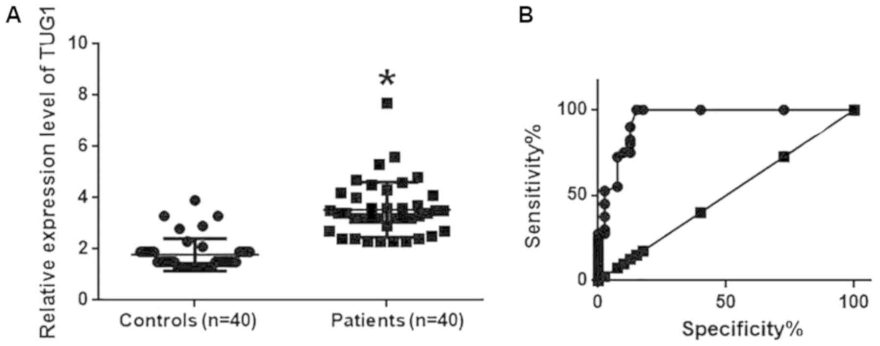 Osteosarcoma is a rare but devastating disease. Although genetic factors, including tumor protein P53 and retinoblastoma tumor suppressor gene, have been demonstrated to be involved in the development of osteosarcoma, the pathogenesis of this disease remains poorly characterized (12,13). LncRNA is a group of functional RNAs that do not encode proteins. Despite the lack of protein-coding ability, lncRNAs have been shown serve a role in almost every aspect of critical biological and pathological processes (14). Previous studies have found that the development of osteosarcoma is closely associated with the abnormal expression of a number of lncRNAs (9,15,16). In particular, high levels of lncRNA TUG1 have been shown to be associated with poor prognosis in patients with osteosarcoma (9). In osteosarcoma cell lines, lncRNA TUG1 expression is upregulated compared with that in normal osteoblastic cells, and the overexpression of lncRNA TUG1 promotes osteosarcoma cell proliferation (15). By contrast, the downregulation of lncRNA TUG1 has been shown to reduce osteosarcoma cell proliferation and increase cancer cell apoptosis (16). In addition, an association of the upregulation of lncRNA TUG1 with the poor survival of osteosarcoma patients has been reported (9). Consistent with these findings from previous studies, the present study revealed that the expression levels of TUG1 were significantly higher in osteosarcoma tissues compared with adjacent healthy tissues. TUG1 levels were also demonstrated to be higher in the plasma samples of osteosarcoma patients compared with those from healthy controls. Taken together, this suggests that TUG1 may serve a role as an oncogene in osteosarcoma.