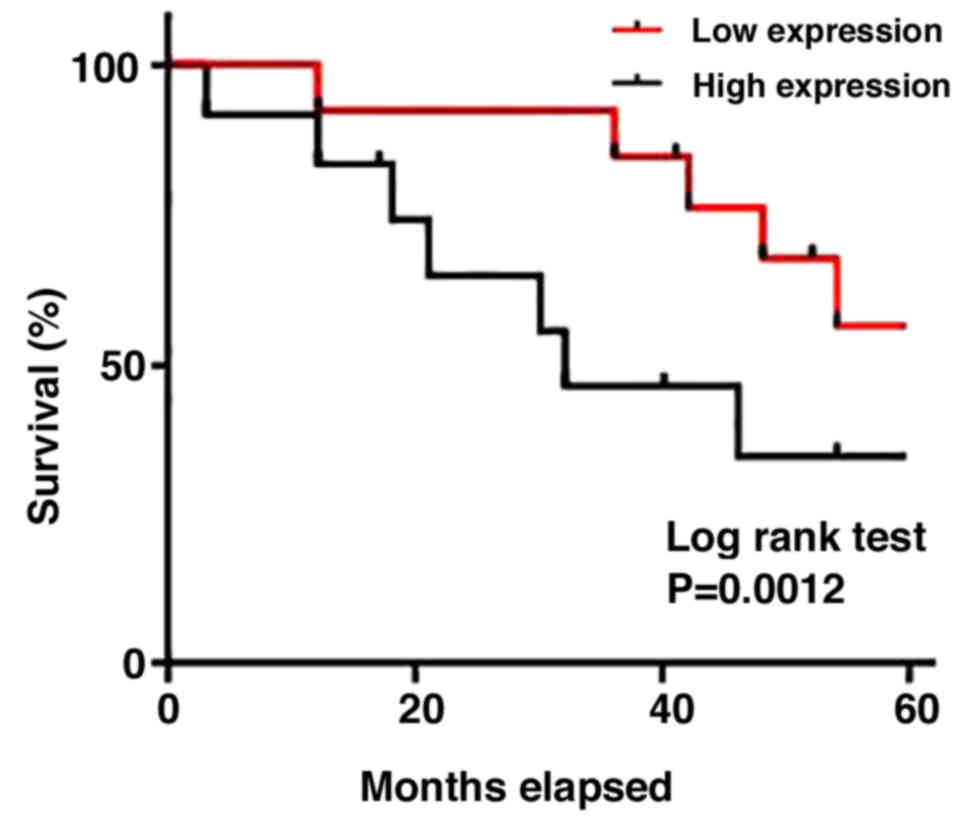 A total of 40 patients with osteosarcoma (22 males and 18 females; age range, 11–78 years; average age, 41±11.1 years) were selected in the 2nd Affiliated Hospital of Zhejiang University School of Medicine (Zhejiang, China) from January 2009 to January 2011. Inclusion criteria: i) All patients were diagnosed by pathological and imaging examination; ii) newly diagnosed cases. Exclusion criteria: i) Recurrent patients; ii) patients who have been treated; iii) patients with multiple newly diagnosed clinical disorders. Distant metastasis was detected in 26 patients. All patients received surgical resections, with tumor tissues and adjacent healthy tissues within the region 0.5 cm from the tumor boundary being collected during surgery. Within the same timeframe, 40 healthy individuals (20 males and 20 females; age range, 16–72 years; average age, 40±9.8 years) were selected as controls. Blood (5 ml) was extracted from each patient and control before therapies under fasting conditions. Blood was centrifuged in EDTA tubes at room temperature for 10 min at 1,200 × g to obtain plasma. There were no significant differences in age, sex and other basic information between the two groups. This study was approved by the ethics committee of The 2nd Affiliated Hospital of Zhejiang University School of Medicine, and all patients provided signed informed consent. Follow-up was performed for 60 months to monitor the survival of the patients.