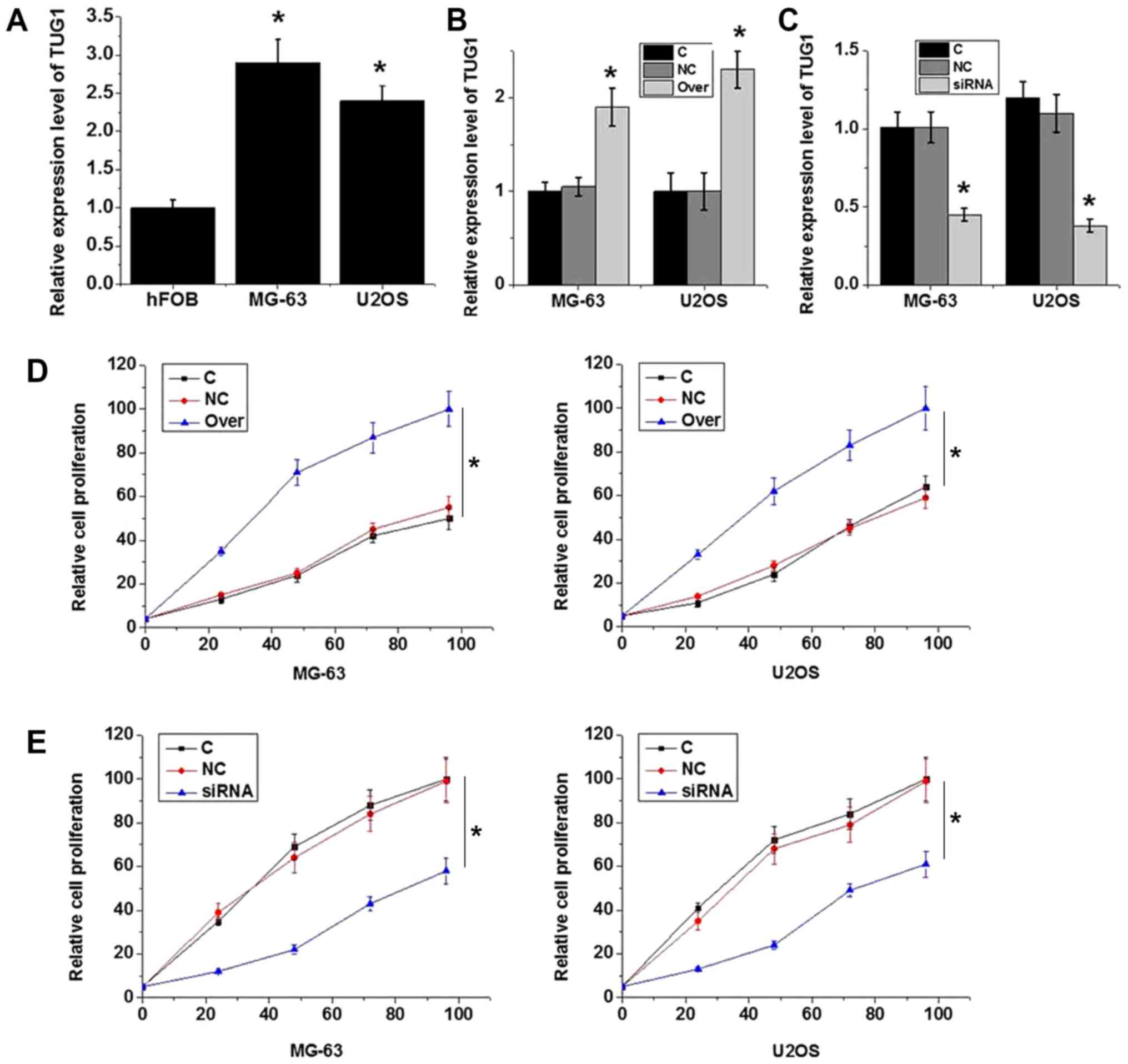 The expression levels of TUG1 were found to be significantly lower in the hFOB human normal bone cell line compared with those in the MG-63 and U2OS osteosarcoma cell lines (P<0.05; Fig. 4A). According to RT-qPCR results, transfection with plasmid expressing TUG1 significantly increased TUG1 expression (P<0.05; Fig. 4B), whereas transfection with TUG1 siRNA significantly reduced TUG1 expression in MG-63 and U2OS cells (P<0.05; Fig. 4C), demonstrating that the transfection was efficient. TUG1 overexpression significantly increased MG-63 and U2OS cell viability (P<0.05; Fig. 4D), while TUG1 knockdown significantly reduced cell viability (P<0.05; Fig. 4E). These data suggest that the expression level of TUG1 is positively associated with viability in osteosarcoma cells.