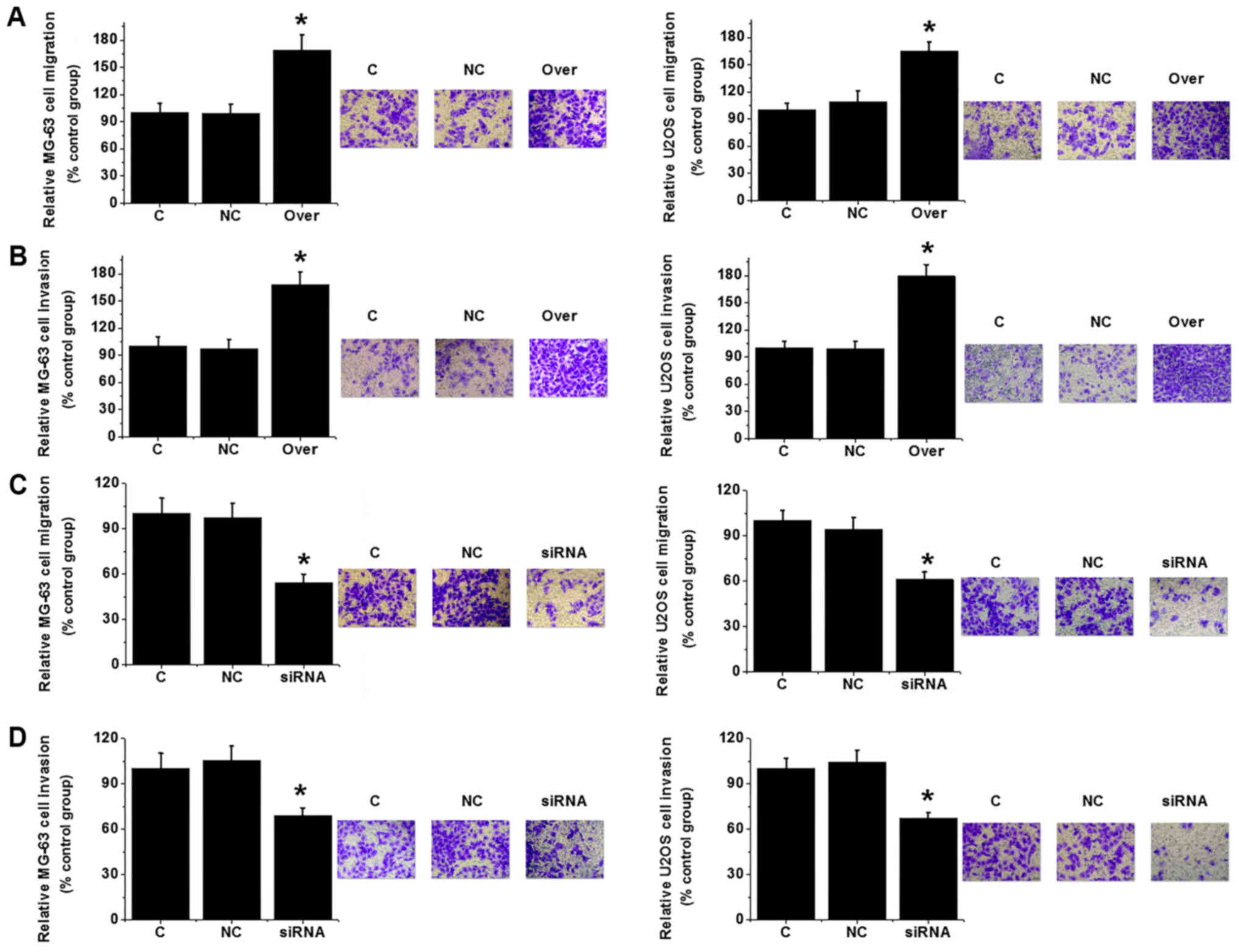 Transwell migration and invasion assays were performed to investigate the effects of changes in TUG1 expression on cell migration and invasion. TUG1 overexpression significantly increased MG-63 and U2OS cell migration and invasion (P<0.05; Fig. 5A and B). By contrast, TUG1 knockdown significantly reduced the migratory and invasive capabilities of the same cell lines (P<0.05; Fig. 5C and D). Those observations suggest that expression level of TUG1 is positively associated with the migration and invasion abilities of osteosarcoma cells.