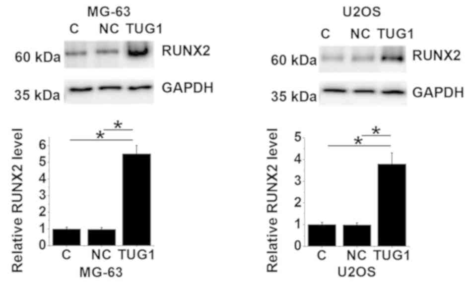The RUNX2 protein expression levels of MG-63 and U2OS cells overexpressing TUG1 were evaluated using western blot analysis. Compared with un-transfected control and negative control cells transfected with empty vectors, lncRNA TUG1 overexpression resulted in significantly upregulated RUNX2 expression in both cell lines (P<0.05; Fig. 6).