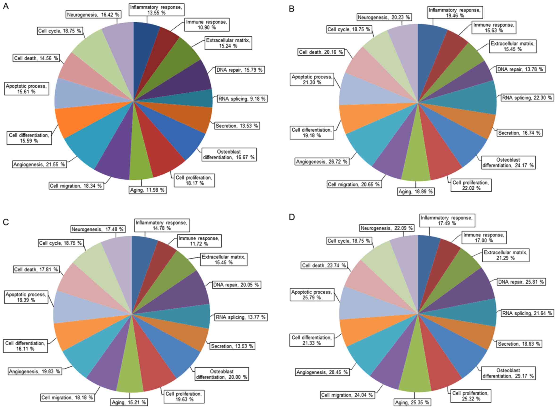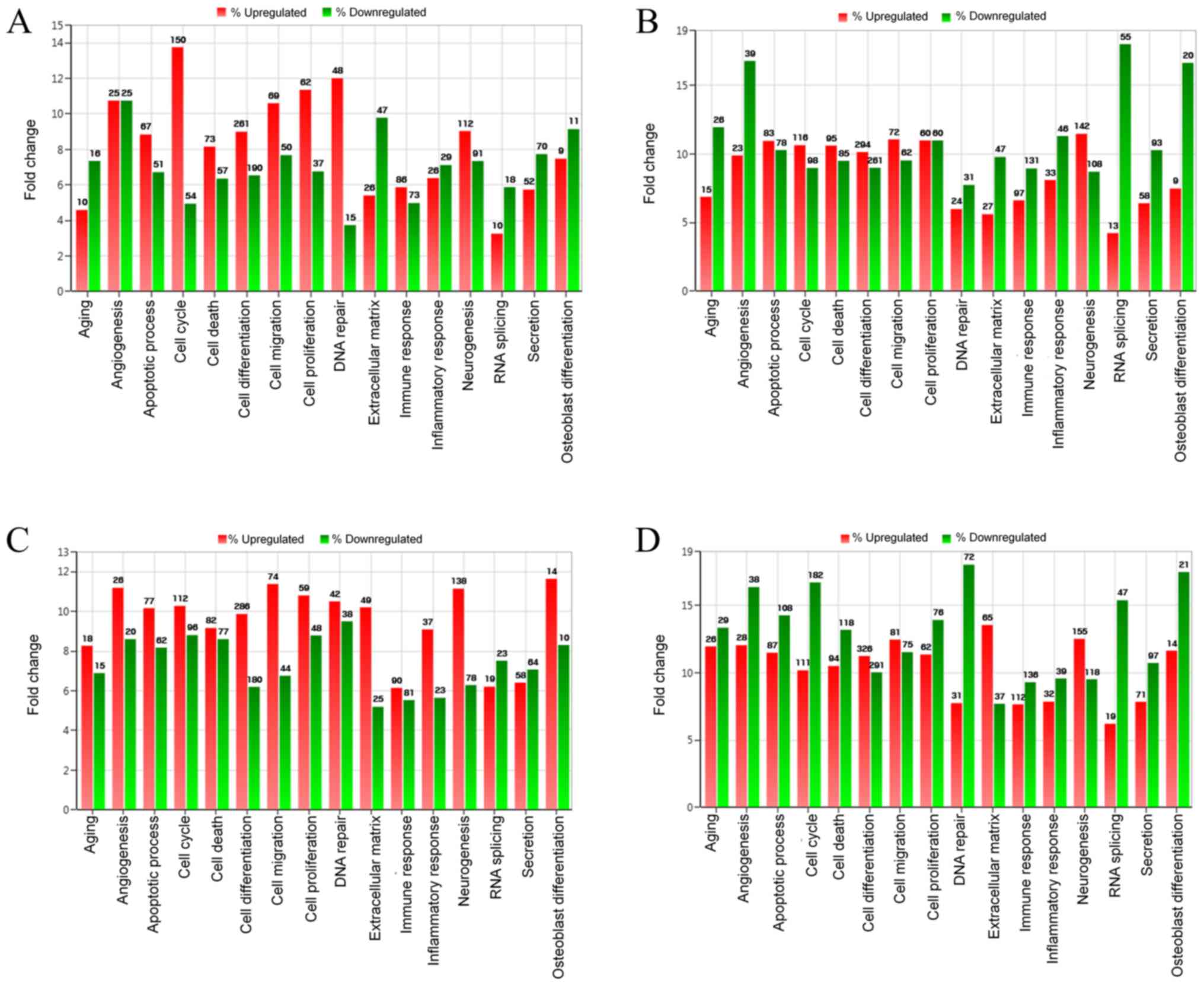Differentially expressed mRNAs in this study is a total of 25,737. The scatter plots displaying differentially expressed mRNAs, are illustrated in Fig. 1. Gene ontology analysis of mRNA expression is categorized by its importance and the selection criteria were fold change ≥1.3 and log2 normalized read counts ≥4 (Fig. 2). Fig. 3 shows gene ontology analysis of mRNA expression by upregulation and downregulation (fold change of 1.3 or greater, log2 normalized read counts of 4 or greater were selected).