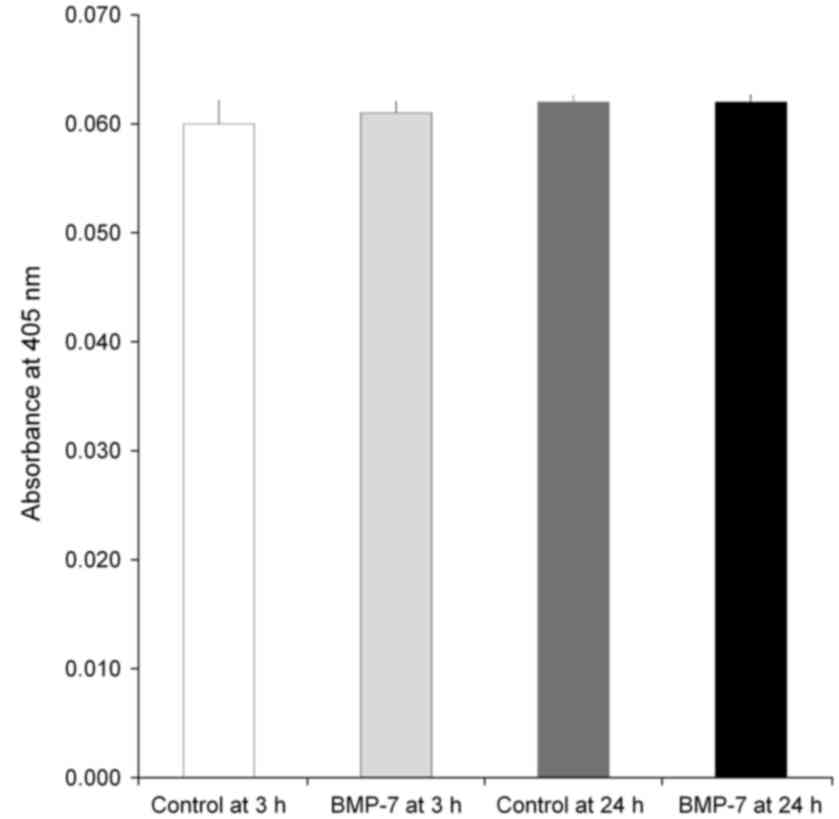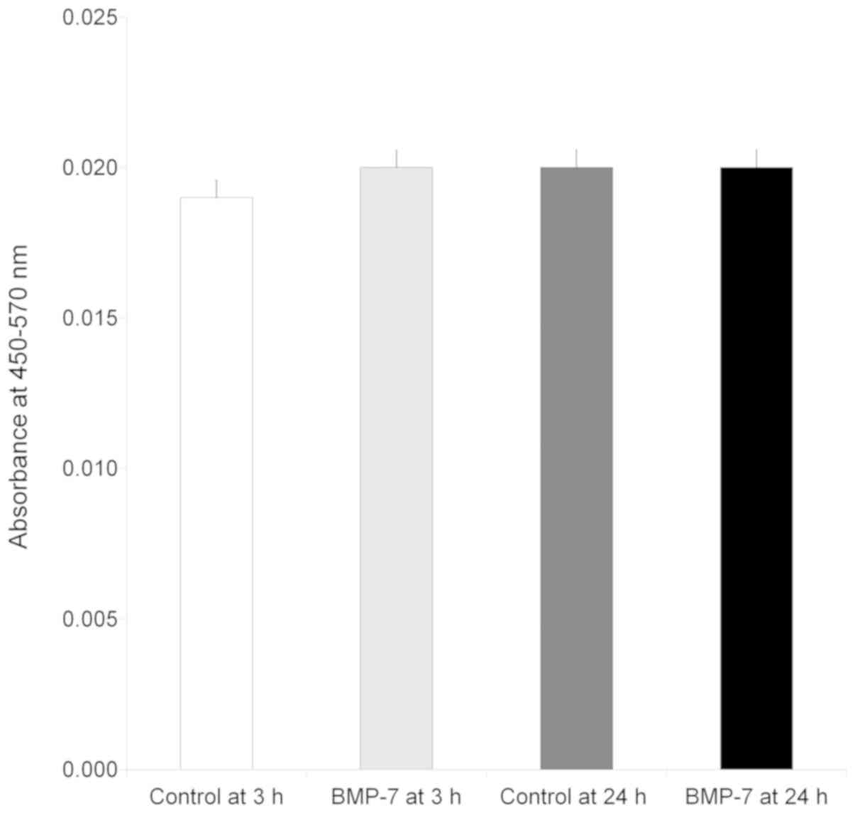 The data of the alkaline phosphatase activity assays at Day 7 are demonstrated in Fig. 8. The absorbance values at 405 nm at Day 7 for control at 3 h, BMP-7 at 3 h, control at 24 h and BMP-7 at 24 h were 0.060±0.002, 0.061±0.001, 0.062±0.001, and 0.062±0.001, respectively (P>0.05).