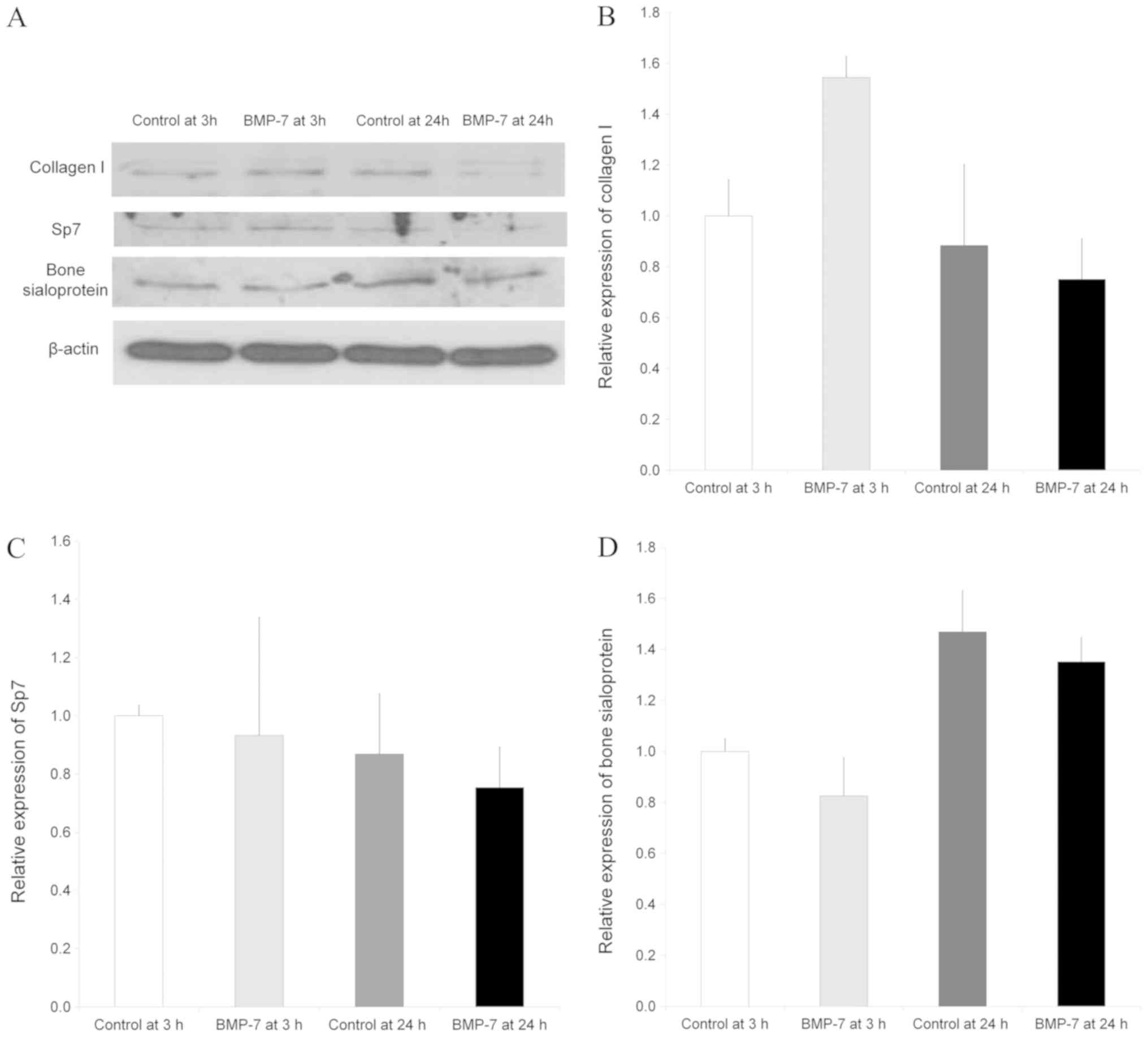 The expression of Sp7 in the control group at 24 h did not show significant change compared with the control at 3 h. Normalization of the protein expressions revealed that the control at 24 h showed 86.8±20.7% expression of Sp7, and the group treated with BMP-7 yielded 93.2±40.6% and 75.4±13.9% of expression of Sp7 at 3 and 24 h, respectively, compared to control values at 3 h as a baseline of 100% (100.0±3.6%) (P>0.05, Fig. 6C).
