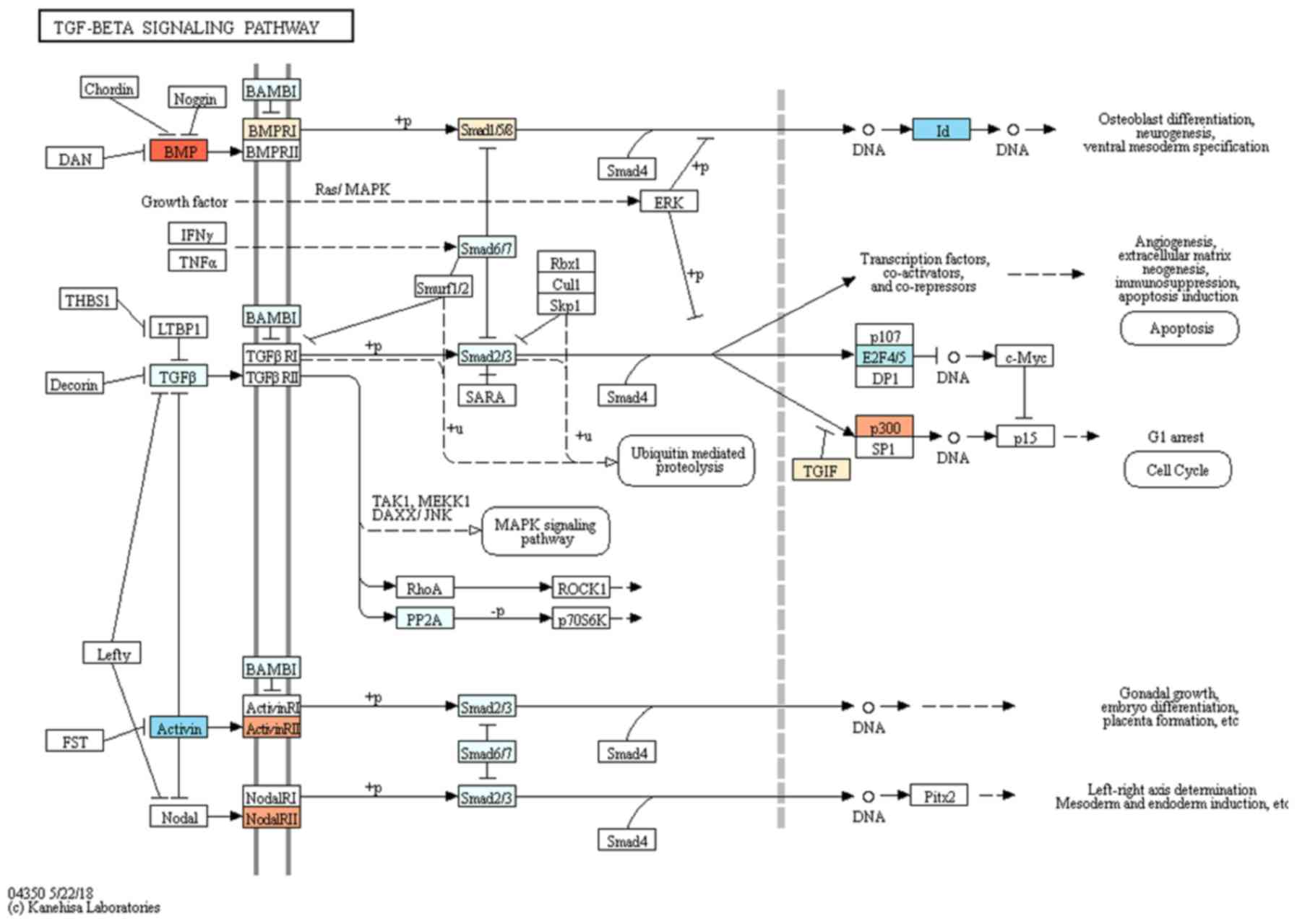 The relative expression of bone sialoprotein is shown in Fig. 6C. Normalization of the protein expressions demonstrated that the control at 24 h showed 146.8±16.4% expression of bone sialoprotein, and the group treated with BMP-7 yielded 82.5±15.1% and 135.1±9.6% of expression of bone sialoprotein at 3 and 24 h, respectively, when the control value at 3 h were considered 100% (100.0±5.0%). TGF-β signaling pathway was associated with the target genes selected for osteoblast differentiation (Fig. 7).