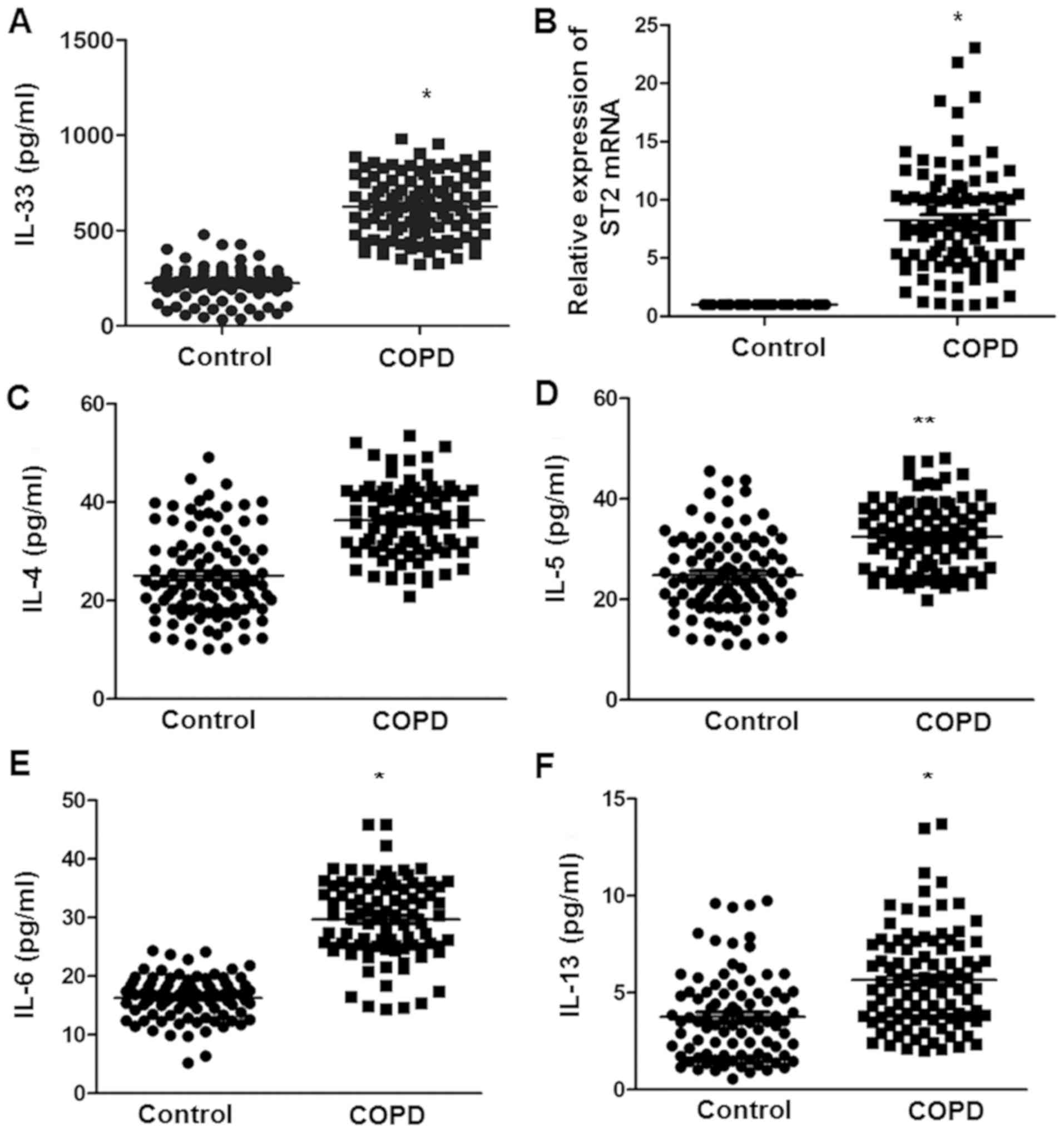 Kim SW, Rhee CK, Kim KU, Lee SH, Hwang HG, Kim YI, Kim DK, Lee SD, Oh YM and Yoon HK: Factors associated with plasma IL-33 levels in patients with chronic obstructive pulmonary disease. Int J Chron Obstruct Pulmon Dis. 12:395–402. 2017. View Article : Google Scholar : PubMed/NCBI | |