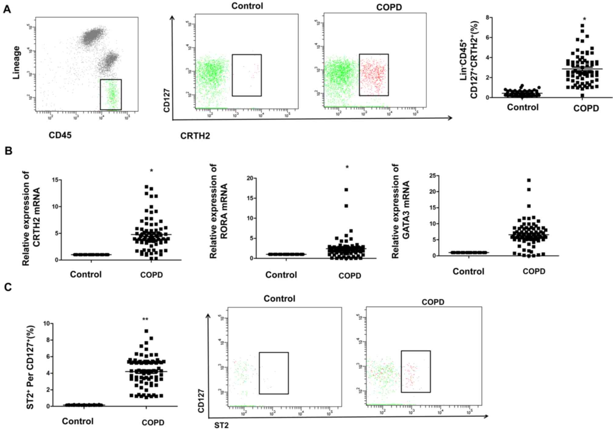 In the present study, Lin−CD45+CD127+CRTH2+ cells were detected in peripheral blood by using flow cytometry, and the changes in the percentage of ILC2 cells in peripheral blood of control and COPD subjects were analyzed to determine whether they are involved in the pathogenesis of COPD. The results indicated that the proportion of ILC2 cells in the peripheral blood of COPD patients was significantly higher than that in the control group (Fig. 2A). Furthermore, RT-qPCR was used to detect the mRNA expression levels of transcription factors in PBMCs of control and COPD subjects. The results indicated that the relative mRNA expression levels of CRTH2 and RORA in PBMCs of COPD patients were significantly higher than those in the controls (P<0.05; Fig. 2B). The expression of ST2 on the surface of ILC2 cells was then determined using flow cytometry. As presented in Fig. 2C, a high expression of ST2 on the surface of ILC2 cells was identified in COPD patients, which was significantly higher than that in the control group. The above results indicate that ILC2s accounted for a large proportion of PBMCs in COPD patients, suggesting a role of ILC2s in COPD.