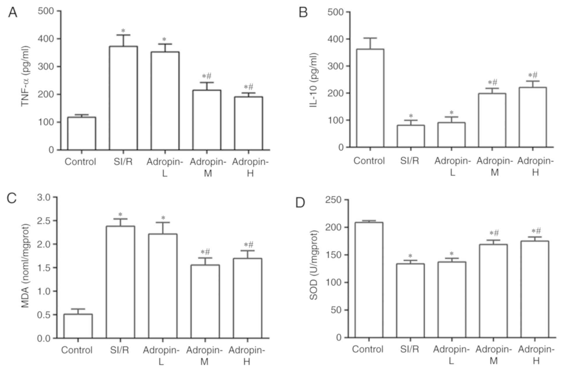 Oxidative stress was examined by measuring MDA levels and SOD activity (Fig. 3C and D, respectively). MDA levels significantly increased (P<0.001) and SOD activity was significantly reduced in the SI/R group (P<0.001) compared with the control group. The adropin-M and adropin-H groups exhibited reduced MDA levels (P<0.001) and exhibited higher SOD activity (P<0.001) compared with the SI/R group. The results indicated that adropin may inhibit lipid peroxide production and increase scavenging superoxide radical activity. No significant difference in MDA levels and SOD activity were determined between the adropin-M and adropin-H groups. Adropin-L did not reduce MDA levels or increase SOD activity when compared with the SI/R group, demonstrating the dose-dependent role of adropin in the antioxidative effect.