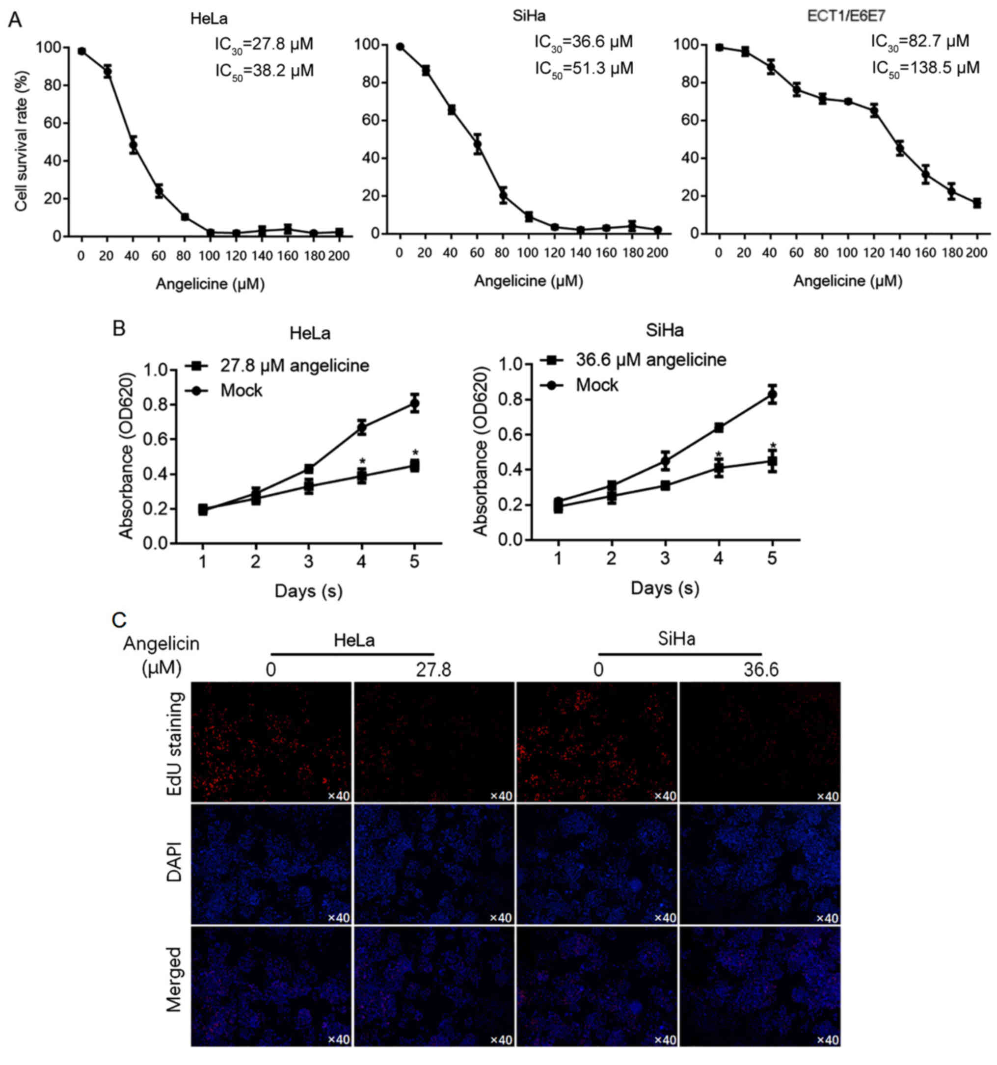 It has been reported that angelicin is cytotoxic to hepatic cancer cells (10). To investigate the effects of angelicin in cervical cancer cells (HeLa and SiHa), cell viability was determined using CCK-8 assay following exposure to a range of angelicin concentrations for 24 h. For comparison, the sensitivity of cervical epithelial cells (ECT1/E6E7) to angelicin was also measured to evaluate the 30% inhibitory concentration (IC30) and 50% inhibitory concentration (IC50). The results revealed that HeLa (IC30, 27.8 µM; IC50, 38.2 µM) and SiHa (IC30, 36.6 µM; IC50, 51.3 µM) cells were more sensitive to angelicin than ECT1/E6E7 cells (IC30, 82.7 µM; IC50, 138.5 µM; Fig. 1A). Cell viability was assessed on days 1–5 following treatment with angelicin at the IC30. The results revealed that Angelicin treatment significantly inhibited HeLa and SiHa cell proliferation (P<0.05 vs. mock group containing vehicle only; Fig. 1B). To confirm that the decrease in cell viability was due to a change in cell proliferation, EdU labelling of proliferating cells was performed. The results revealed that HeLa and SiHa cell treatment with angelicin at the IC30 substantially decreased the number of proliferating cells compared with the control (Fig. 1C).