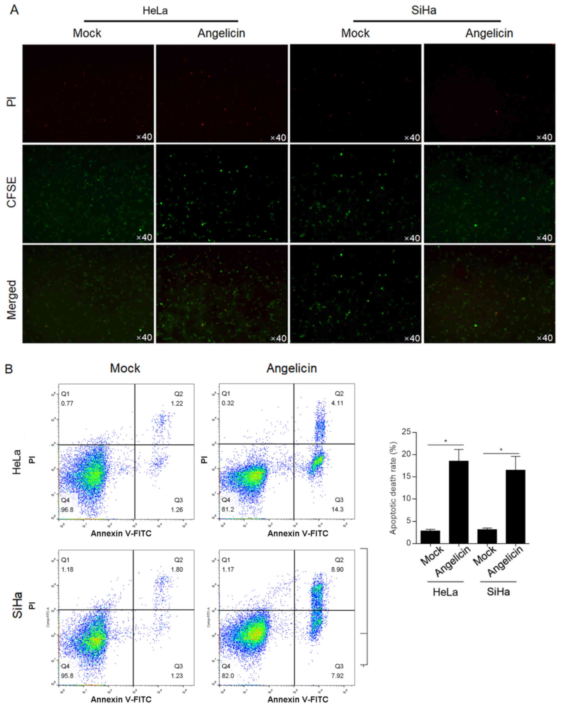 The cytotoxic effect of angelicin was verified by a cytotoxicity assay with CFSE-labelled HeLa or SiHa cells. CFSE-positive cells demonstrated no significant change following angelicin treatment compared with mock treated cells (Fig. 3A). Following PI staining, it was observed that angelicin treatment markedly increased the number of PI-positive cells compared with mock treated cells, indicating that angelicin treatment increased the cell death rate (Fig. 3A). To further confirm that the increased cell death by angelicin treatment was due to induction of apoptosis, Annexin V/PI double-staining was performed. Angelicin treatment increased the apoptotic cell death rate (Annexin V+/PI− and Annexin V+/PI+) in both HeLa (18.7±2.4%) and SiHa (16.9±3.1%) cells (P<0.05; Fig. 3B). Taken together, the results indicated that angelicin treatment inhibited the malignant behaviours of HeLa and SiHa cervical cancer cells and induced apoptotic cell death.