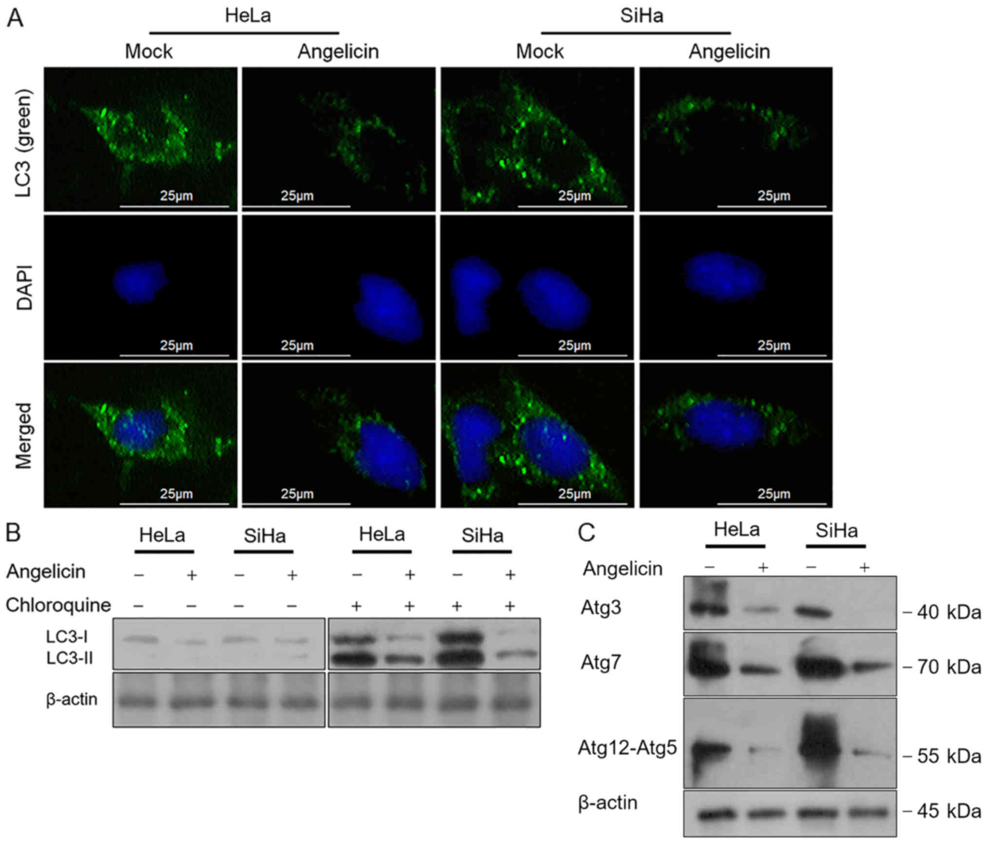 The chemotherapy-induced inhibition of cell viability, proliferation or cell death leading to the demise of cancer cells is mediated by autophagic pathways (15,16). Therefore, the effects of angelicin treatment on autophagy were investigated in the present study. The regulatory effects of angelicin on autophagy were assessed by performing LC3B immunostaining. The results revealed that the LC3B-stained signal was greatly decreased following angelicin treatment for 24 h compared with the mock group in HeLa and SiHa cells (Fig. 4A). Chloroquine, a lysosome inhibitor inhibiting the fusion of autophagosomes and lysosomes and/or the activity of autolysosomes (17) was employed to accumulate LC3B-I and -II. Following the inhibition of LC3B degradation, the results revealed that angelicin treatment decreased the quantity of LC3B and cleaved LC3B-II compared with mock cells (Fig. 4B). The formation of an autophagosome involves the coordinated action of several Atg protein complexes (18–20). Thus, the expression of certain Atg proteins, including Atg3, Atg7 and Atg12-5, was determined via western blot analysis. Consistent with the change in LC3B, Atg3, Atg7 and Atg12-5 protein levels decreased following angelicin treatment compared with mock treatment (Fig. 4C).