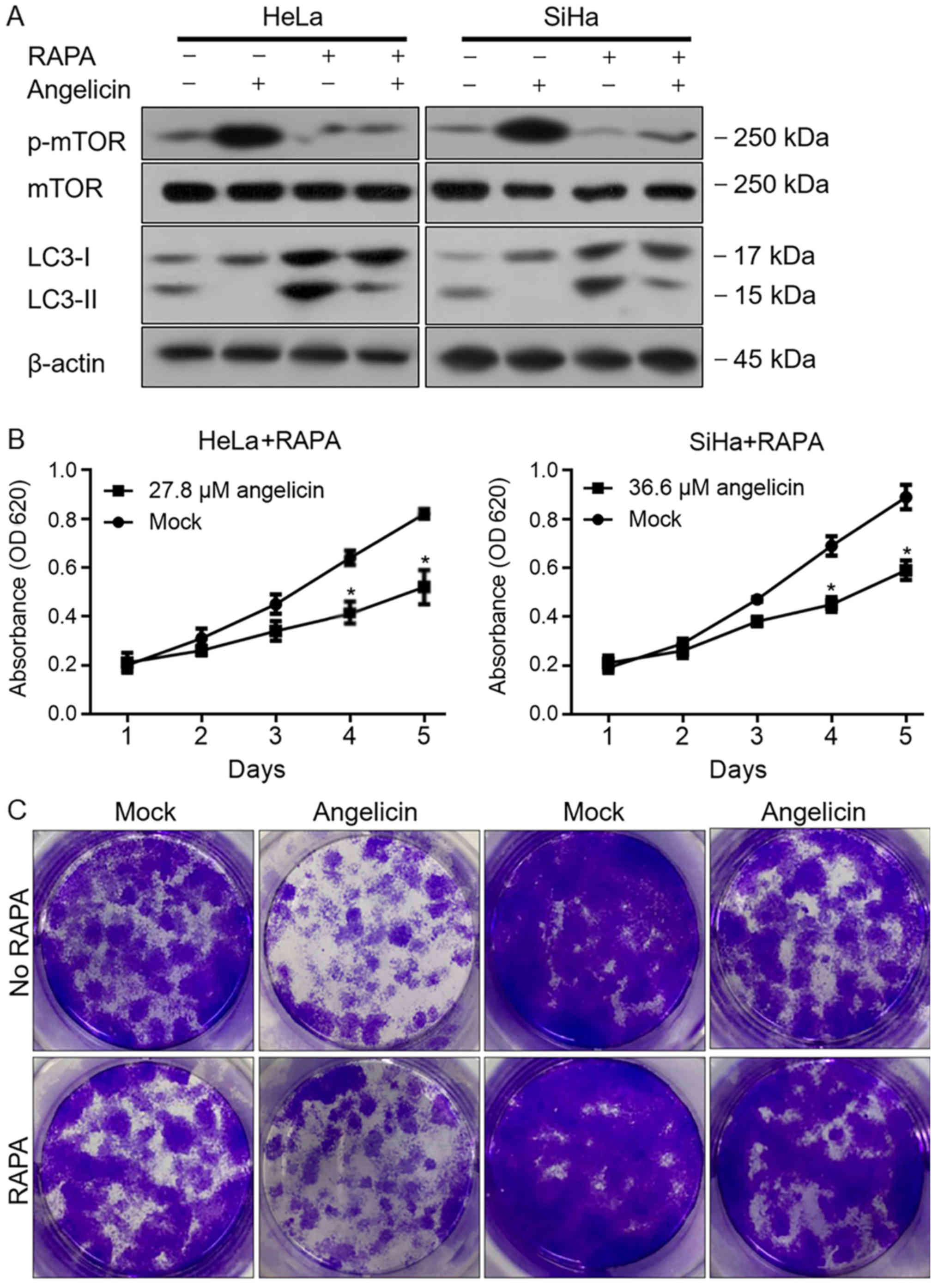 mTOR is a central regulator of several physiological processes, including autophagy. Therefore, the current study assessed whether angelicin treatment regulated mTOR and thus affected autophagy. The results revealed that Angelicin treatment markedly increased the phosphorylation of mTOR in HeLa and SiHa cells, and decreased LC3B-II when compared with mock treated cells (Fig. 5A). Following the addition of rapamycin, angelicin-induced mTOR phosphorylation was decreased, but the inhibitory effects of angelicin on autophagy were not fully reversed, indicating that mTOR might not be a direct target of angelicin, at least in part. To further confirm these results, cell viability and colony formation were measured following co-incubation with rapamycin and angelicin or rapamycin alone. As presented in Fig. 5B and C, angelicin treatment decreased the malignant behaviors of HeLa and SiHa cells, and indicated that rapamycin may exert its inhibitory effect in an mTOR-independent manner. Taken together, the results indicated that angelicin treatment regulated the phosphorylation of mTOR; however, this was not the main mechanism for affecting autophagy, which remains unknown.