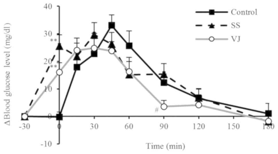 In the present study, blood glucose levels rose within 30 min after the consumption of the sugar solution or vegetable juice (0 min). However, the increase was less pronounced in the VJ group than in the SS group, presumably owing to the dietary fiber, organic acids and polyphenols in the vegetable juice. The rapid increase in blood glucose levels in the SS and VJ groups may be responsible for the significantly higher plasma insulin levels in these groups compared with those in the control group at 15 min; at this time-point, the plasma insulin levels tended to be higher in the SS group compared with those in the VJ group.