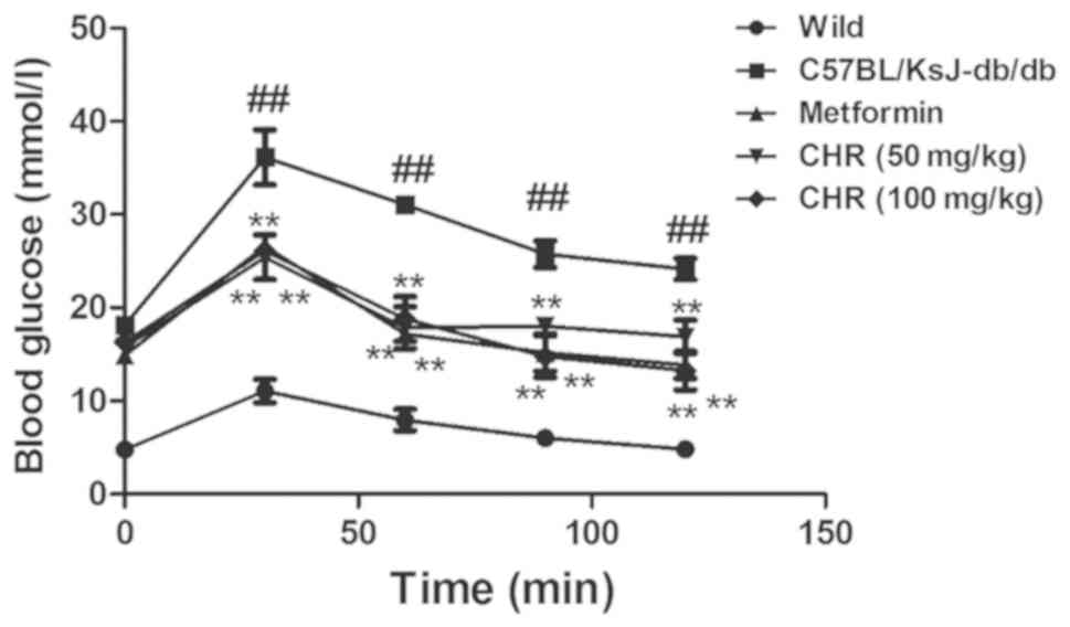 The C57BL/KsJ-db/db group displayed significantly higher blood glucose levels compared with the wild group (Fig. 1). Following treatment with CHR (50 and 100 mg/kg), the blood glucose levels of the C57BL/KsJ-db/db mice were significantly lower than those of the C57BL/KsJ-db/db mice treated with saline. Metformin (100 mg/kg) similarly decreased the blood glucose concentration of the C57BL/KsJ-db/db mice.