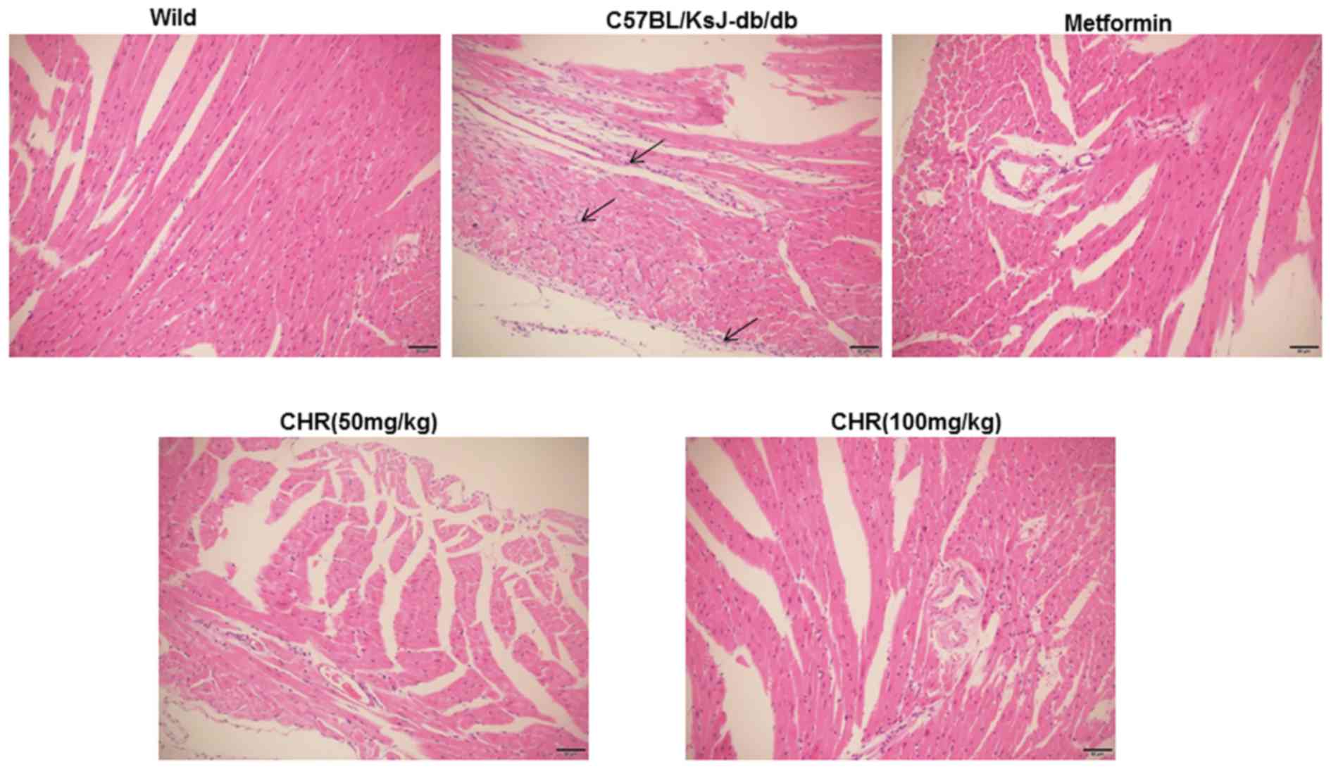 In the wild group, the myocardial cell membranes were intact, the myofibril structure was balanced, and adjacent myofibrils were continuous (Fig. 2). By contrast, a large number of inflammatory cells were observed in the hearts of the C57BL/KsJ-db/db group, myocardial cells were swollen or denatured, myocardial necrosis was evident, and no striations were visible (Fig. 2). CHR or metformin treatment markedly attenuated the pathological changes observed in the diabetic mouse model, especially in the high dose CHR group (Fig. 2).