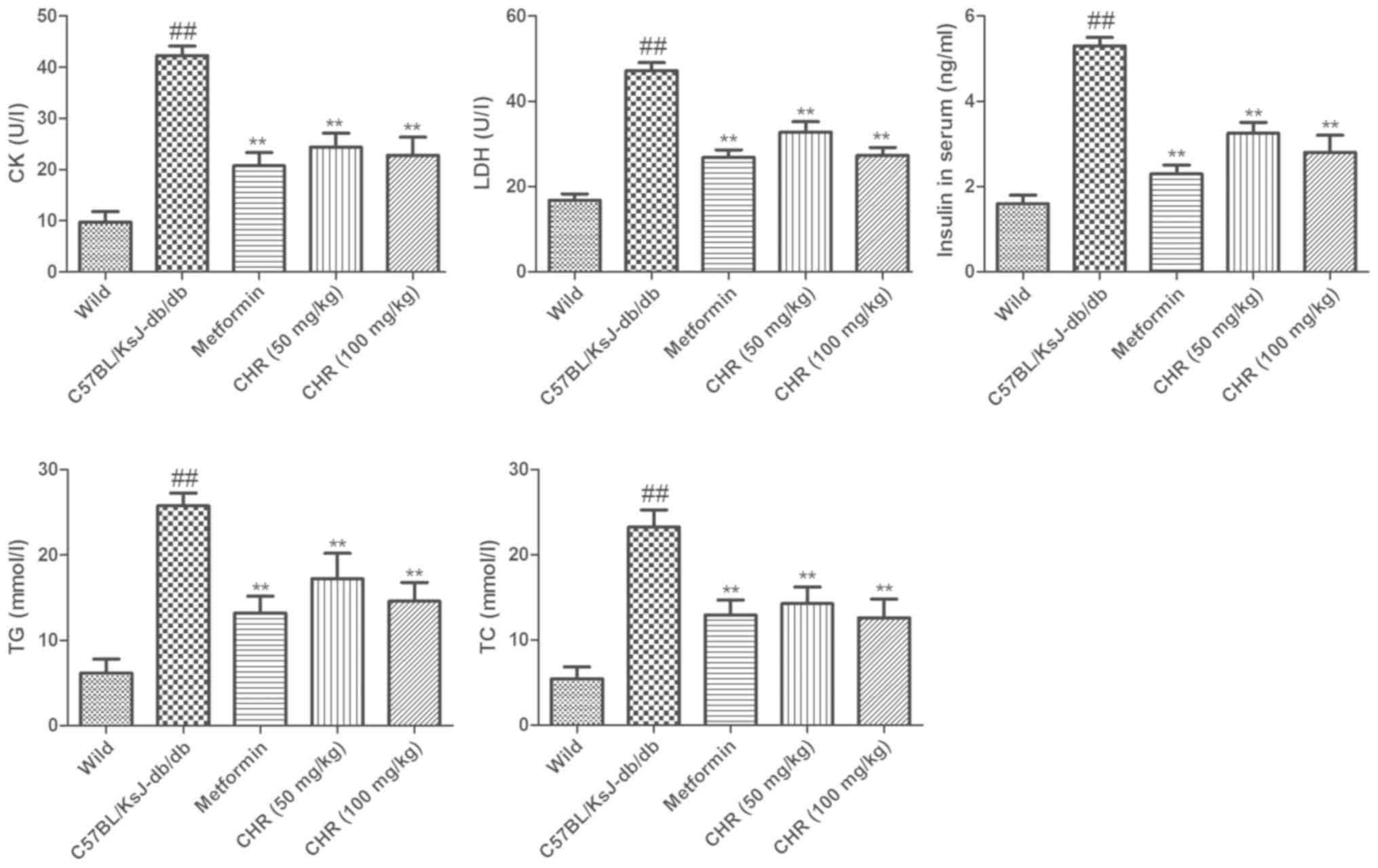 The serum TG and TC levels of C57BL/KsJ-db/db mice were significantly higher compared with those of the wild group (Fig. 3). Treatment with CHR (50 or 100 mg/kg) or metformin significantly attenuated the DM-induced increases in TG and TC levels. To explore the influence of CHR on heart function, the CK and LDH activities and serum insulin levels of the mice were also measured. In the C57BL/KsJ-db/db group, the serum insulin, CK and LDH levels were significantly increased compared with those of the wild group (Fig. 3). Treatment with CHR (50 or 100 mg/kg) or metformin significantly attenuated the DM-induced increases in insulin, CK and LDH levels (Fig. 3).