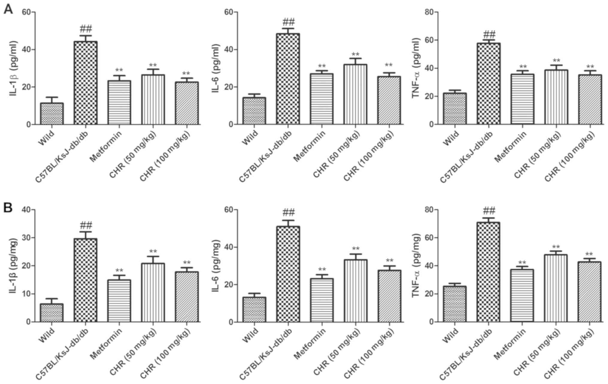 In order to explore the influence of CHR on the inflammatory response, TNF-α, IL-6 and IL-1β levels in the serum and heart tissues of the mice were determined. The results demonstrated that inflammatory cytokine levels in the serum and heart tissues of C57BL/KsJ-db/db mice were significantly higher compared with those of the wild-type control mice (Fig. 4). However, treatment with CHR (50 or 100 mg/kg) or metformin significantly suppressed the levels of inflammatory cytokines in the serum and heart tissues of the C57BL/KsJ-db/db mice (Fig. 4).