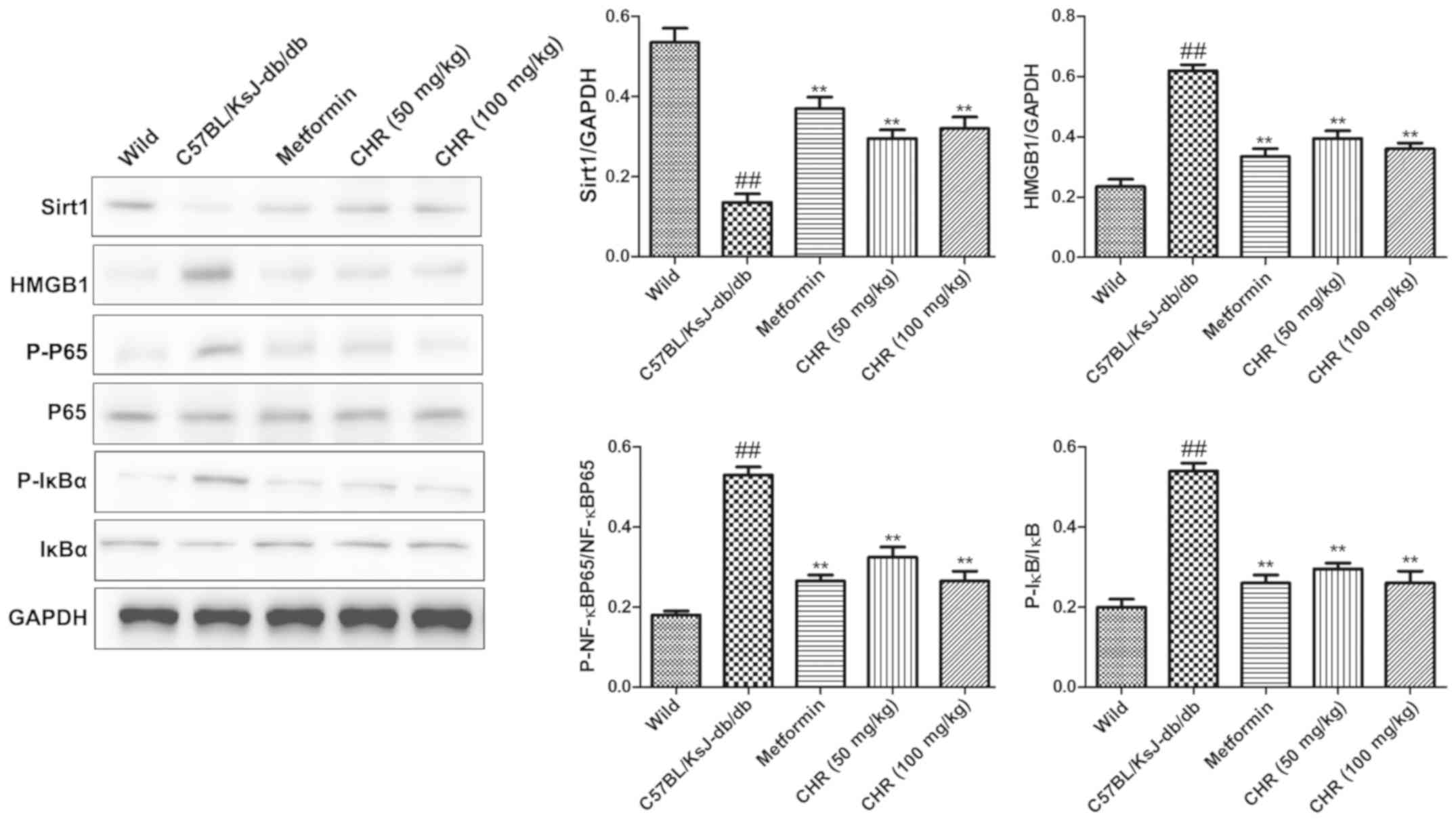 In conclusion, the present study successfully demonstrated the protective effect of CHR against DM-induced heart damage. The possible mechanisms underlying the protective effect of CHR may be associated with the attenuation of inflammation of the heart via regulation of SIRT1 and inhibition of the HMGB1/NF-κB signaling pathway. The present findings provide preliminary evidence suggesting the potential of CHR as a therapeutic drug for DM-induced heart injury.