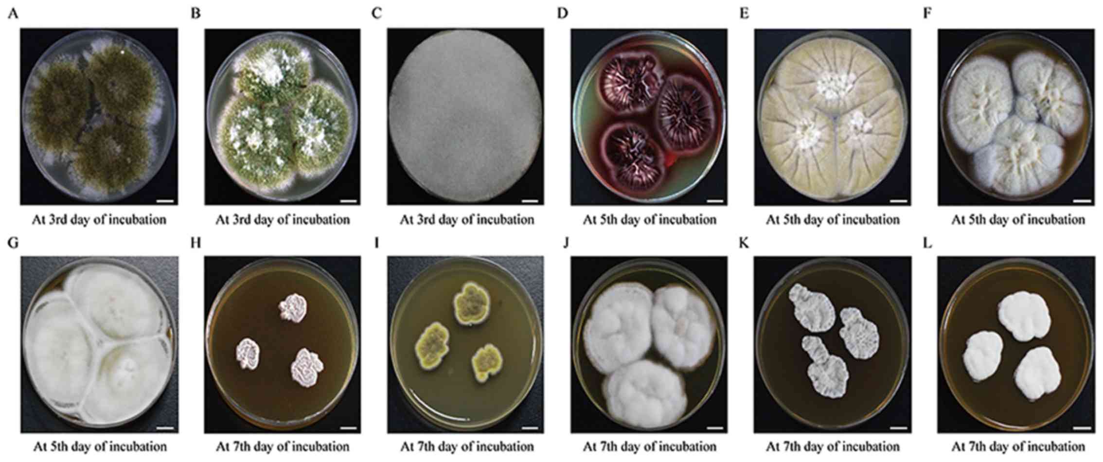 All standard strains and clinical isolates were subcultured on Sabouraud dextrose agar (SDA) at 28°C for 2–6 days. The fungi were first identified by skilled mycologists on the basis of macroscopic and light microscopic features using conventional methods, including lactophenol cotton blue and KOH staining. Briefly, the size, shape, pigment, texture and growth conditions of each isolate were recorded. Subsequently, the spores and hyphae were smeared on glass slides, stained with lactophenol cotton blue (Baso Diagnostic, Inc.) or 10% KOH, and observed under an Olympus IX53 microscope at a final magnification of ×1,000.