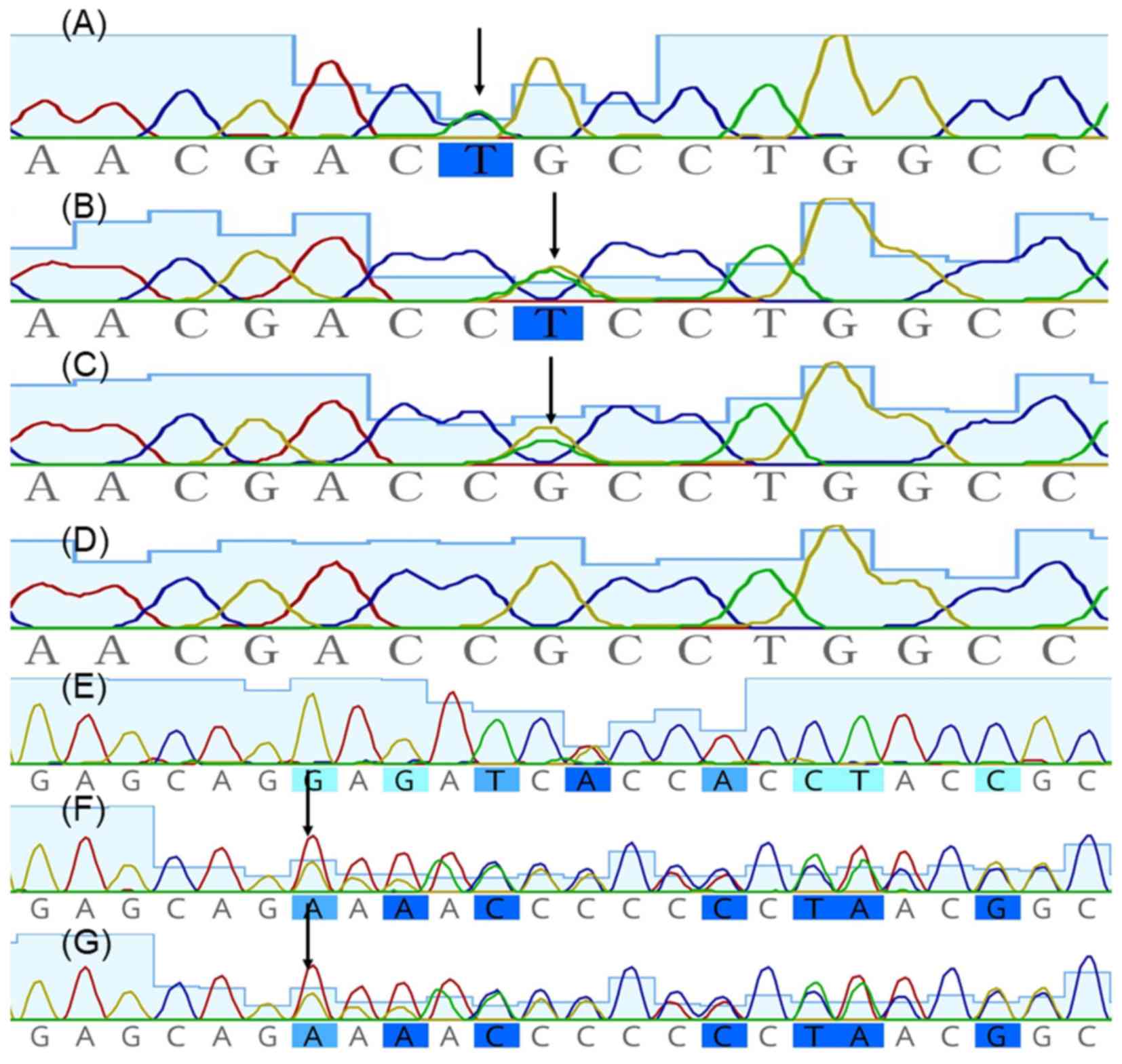 Pedigree charts of these three families are shown in Fig. 2. Mutation screening of KRT5 was negative, whereas heterozygous missense mutations c.374G>T (Arg125Leu), c.373C>T (Arg125Cys) and c.1231delG (p.Glu411Argfs*31) in KRT14 were identified in proband 1, proband 2 and proband 3, respectively, and were absent in unaffected family members (Fig. 3). Mutation delineation was based on comparisons with the reported cDNA reference sequence (GenBank accession number, NM_ 000526.4 for KRT14). Sequencing results were analyzed using Geneious, version 5.6.7 (Biomatters, Ltd.; http://www.geneious.com/).