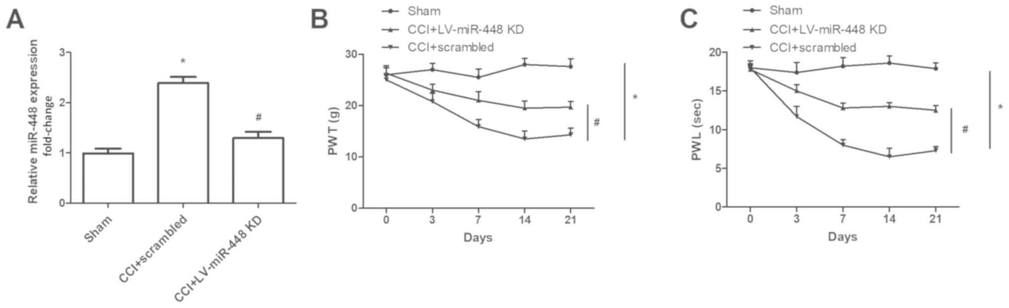 miRNAs are a class of non-coding RNAs 18–24 nucleotides in length. A number of miRNAs have been shown to be aberrantly expressed in various types of diseases, including inflammatory diseases, heart diseases and several types of human cancer (23,24). Increasing evidence has reported that miRNAs may be involved in the development of neuropathic pain development (11,12). Altered expression of miR-448 has been detected in various human diseases. For instance, miR-448 was expressed at low levels in glioma cells, and suppressed cell proliferation and promoted apoptosis (25). Zhang et al (26) suggested that miR-448 was highly expressed in vascular smooth muscle cells (VSMCs) from coronary atherosclerotic plaques, and overexpression of miR-448 promoted VSMC migration. Hong et al (27) indicated that miR-448 is upregulated in gastric cancer tissues compared with adjacent non-tumor samples, and can enhance the glycolytic metabolism of gastric cancer cells by downregulating lysine demethylase 2B (KDM2B). All evidence suggests the various roles of miR-448 in different diseases. In the present study, miR-448 was significantly increased in CCI rat compared with the sham-operated group, and downregulation of miR-448 markedly attenuated the progression of neuropathic pain. A previous study suggested that miR-448 was upregulated in the spinal cord tissues of spinal cord ischemia/reperfusion injury model rats, as well as in cells treated with hypoxia and that downregulation of miR-448 inhibited apoptosis in nerve cells and improved neurological function (28). Additionally, Lu et al (14) reported that the expression level of miR-448 was significantly upregulated in rats treated with sevoflurane compared with controls (14). An et al indicated that lead exposure resulted in the upregulation of miR-448 in rat models (29). The aforementioned studies support the results obtained in the present study.