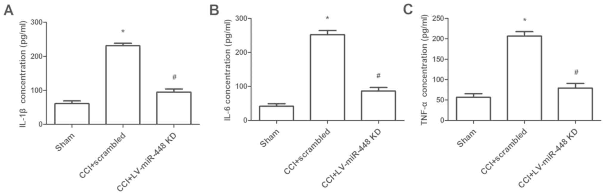 To further investigate the biological effect of miR-448 on neuropathic pain, the expression levels of inflammatory cytokines were measured in CCI rats when miR-448 was downregulated. The protein levels of IL-1β, IL-6 and TNF-α were significantly increased in rats with CCI compared with those in the sham-operated group, and the levels were significantly decreased following treatment with the miR-448 inhibitor (all P<0.05; Fig. 3).
