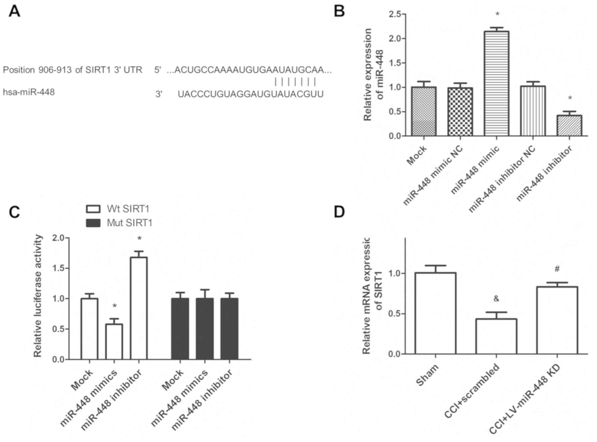 In conclusion, the present study demonstrated that miR-448 promoted the development of neuropathic pain in a rat model of CCI by regulating neuroinflammation via SIRT1. Therefore, miR-448 may serve a novel target for neuropathic pain treatment.