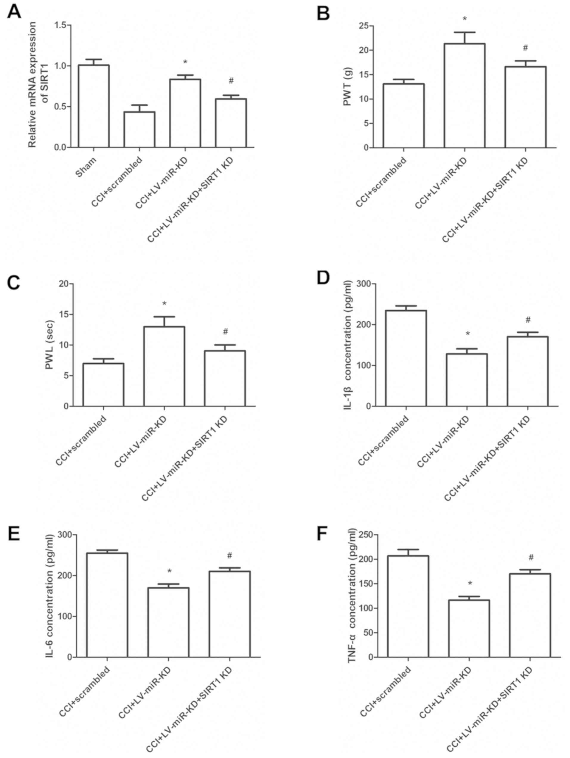 A total of 32 rats were randomly assigned into four groups: Sham group, CCI + LV-miR-scrambled, CCI + LV-miR-448 KD group and CCI + LV-miR-KD + SIRT1 KD group (n=8 per group). A PE-10 polyethylene catheter was inserted into the rats to allow the delivery of the lentiviral vectors. A volume of 10 µl of 0.5% lidocaine (0.9–1.1 mg/kg) was injected into rats through an intrathecal catheter. The catheter was confirmed to be successfully inserted when paralysis of the bilateral hind limbs arose immediately after anesthesia. Then intrathecal catheter was also used for lentivirus injection (1×108 PFU/ml, 10 µl). All rats were euthanized 7 days postoperatively.