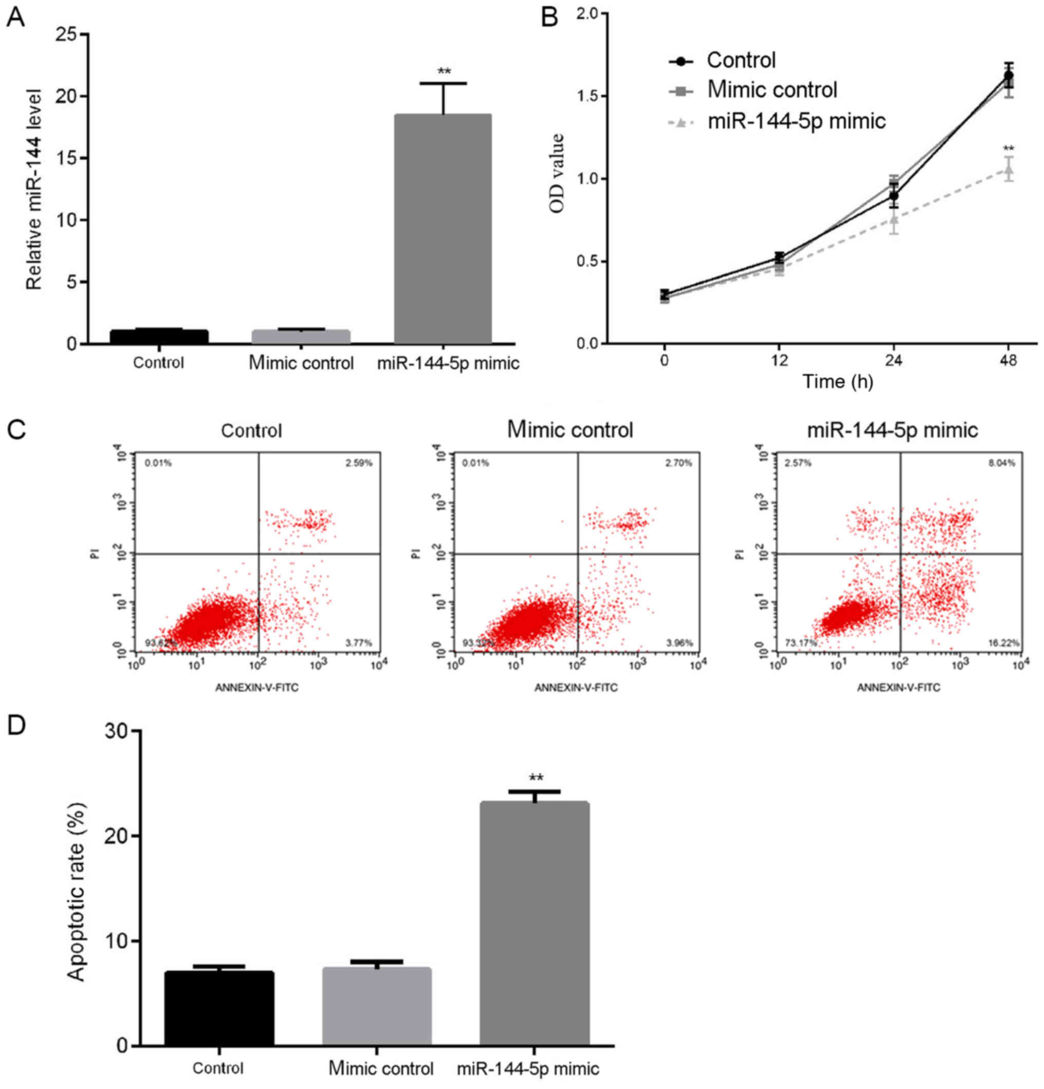 Apoptosis of endothelial cells serves an important role in the occurrence and development of atherosclerosis (22). To study the role of miR-144-5p in atherosclerosis, firstly the effects of miR-144-5p on HUVEC proliferation and apoptosis were explored. HUVECs were transfected with mimic control or miR-144-5p mimic for 48 h. RT-qPCR was used to detect the transfection efficiency, and the results demonstrated that compared with the control group, transfection with miR-144-5p mimic significantly increased the level of miR-144-5p in HUVECs (Fig. 1A). Results from the MTT assay demonstrated that miR-144-5p mimic transfection reduced cell proliferation of HUVECs (Fig. 1B). In addition, to determine whether miR-144-5p regulated the apoptosis of HUVECs, flow cytometric analyses were performed to detect cell apoptosis. The results indicated that miR-144-5p mimic transfection significantly increased the apoptotic rates of HUVECs compare with the control (Fig. 1C and D).