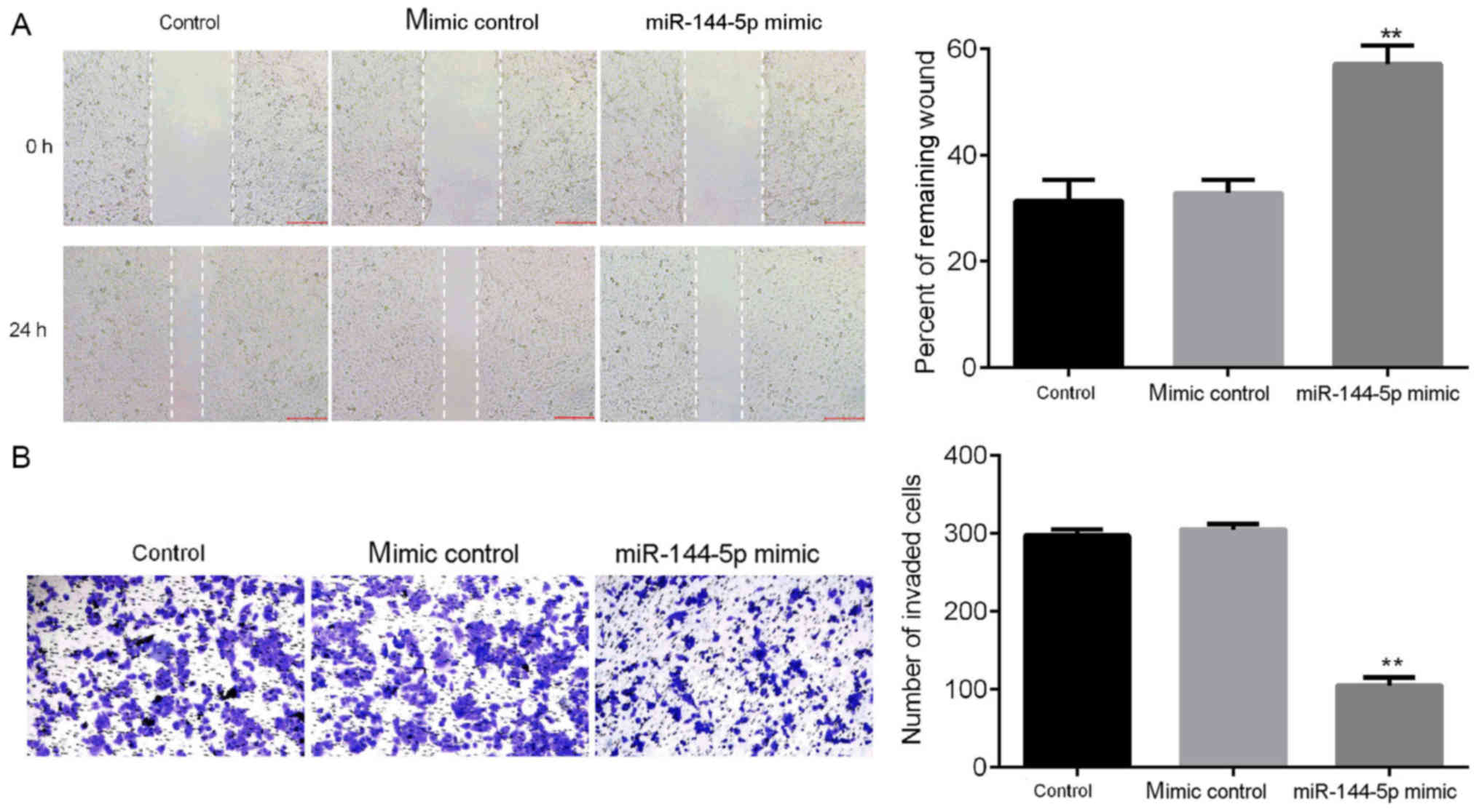 To further examine the effects of miR-144-5p on the biological function of HUVECs, wound healing and Matrigel assays were performed (Fig. 2). The wound healing assay results demonstrated that miR-144-5p mimic suppressed cell migration compared with control groups (Fig. 2A). Matrigel assay results indicated that miR-144-5p mimic significantly inhibited the invasive ability of HUVECs (Fig. 2B). Taken together, these results showed that miR-144-5p inhibited the invasive and migratory potential of HUVECs.