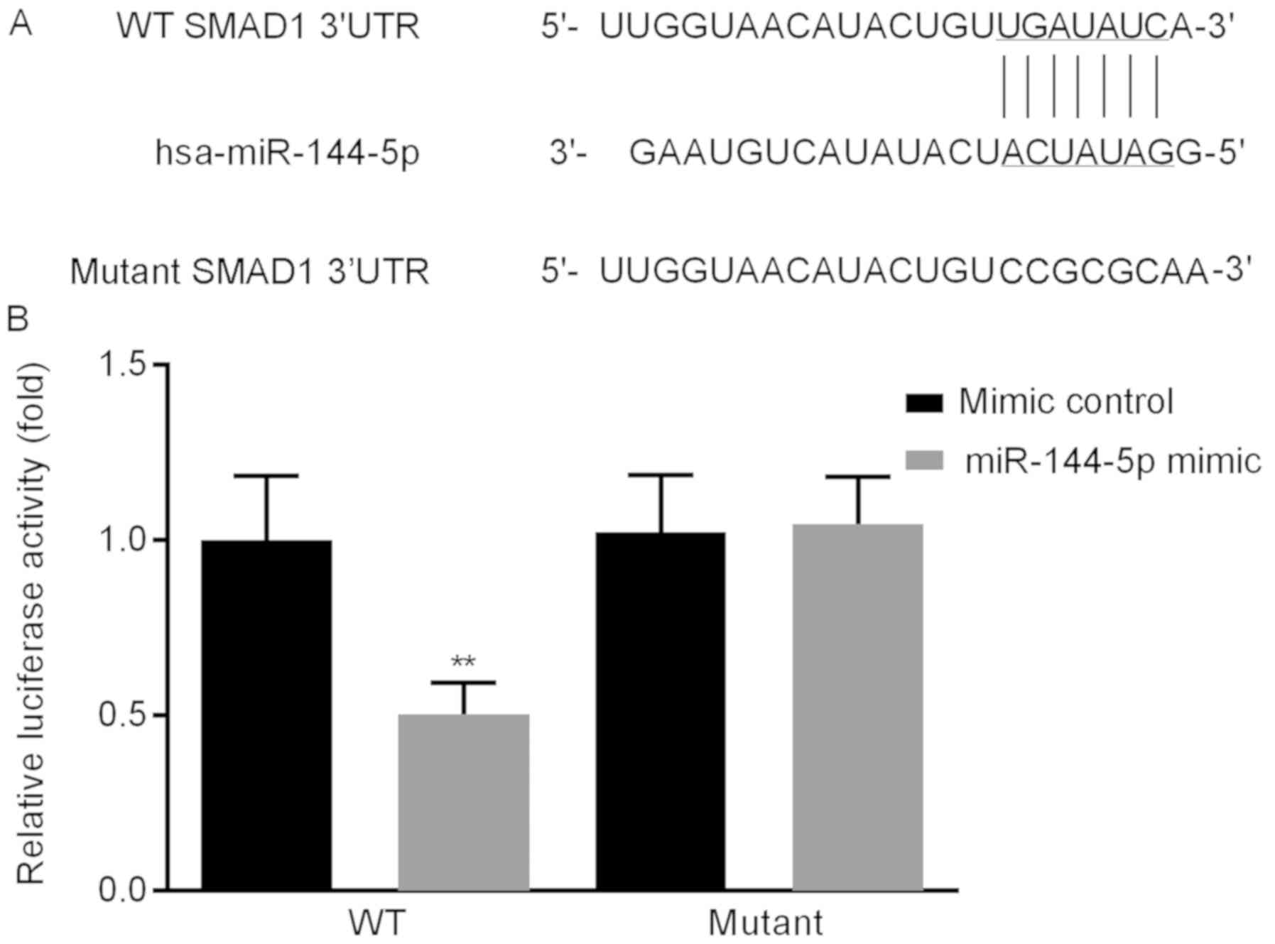 SMAD proteins are intracellular mediators of the transforming growth factor-β family. Smad1/5/8 play an important role in angiogenesis. Phosphorylation and activation of the transcription factors SMAD1/5/8 results in the promotion of angiogenesis. The SMAD1/5/8 signaling pathway, which inhibits extracellular matrix deposition, promotes endothelial cell proliferation and migration (17). A previous study has reported that the balance of proliferation/apoptosis of vascular smooth muscle cells in atherosclerosis is modulated by long non-coding RNA-MEG3 via the regulation of the miR-26a/Smad1 axis (18). In addition, activation of CD137 signaling promotes angiogenesis in atherosclerosis by modulating the endothelial Smad1/5-nuclear factor of activated T cells pathway (19). In a previous study using bioinformatics, it was predicted that SMAD1 was a direct target gene of miR-144-5p (20).