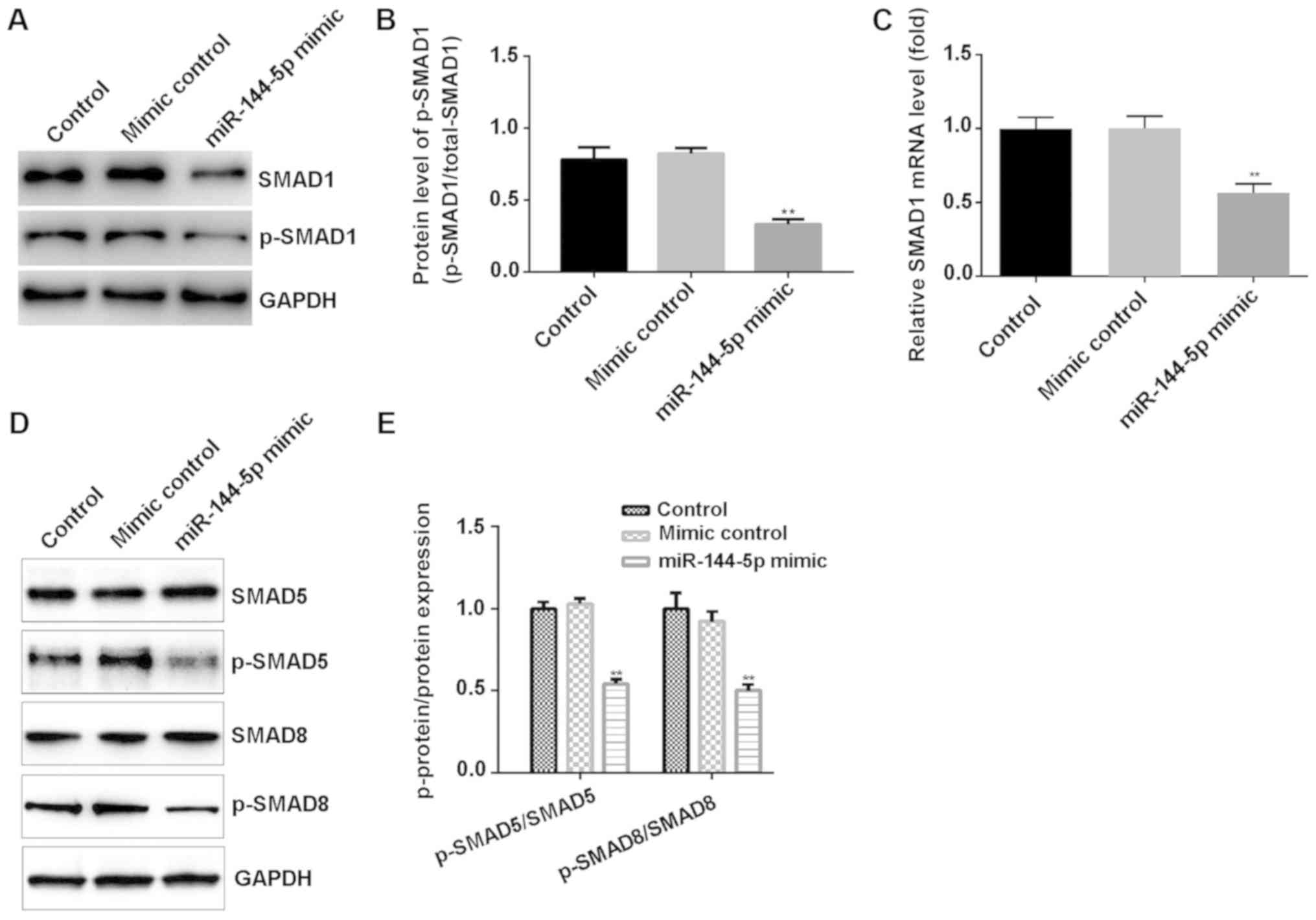 To investigate the specific mechanism of action of miR-144-5p on HUVECs, the expression levels of proteins within the SMAD1/5/8 signaling pathway were examined. Western blot assay suggested that miR-144-5p mimic markedly decreased the protein level of SMAD1 and p-SMAD1 (Fig. 4A), and significantly reduced the ratio of p-SMAD1/SMAD1 (Fig. 4B). RT-qPCR assay results showed that miR-144-5p mimic decreased the relative mRNA expression of SMAD1 in HUVECs (Fig. 4C). Moreover, western blotting indicated that miR-144-5p mimic significantly decreased p-SMAD5/8 protein expression in HUVECs (Fig. 4D and E).
