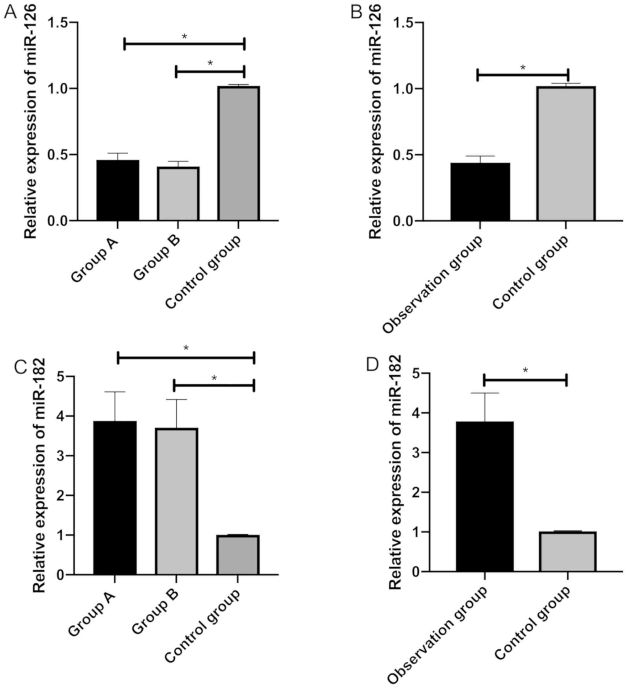 The relative expression of miR-126 was markedly higher in the control group than in group A, group B and the observation group, and group A and group B were different in the miR-126 expression (P<0.05). The relative expression of miR-182 was markedly lower in the control group than in group A and B. Furthermore, the control group, and group A and B were different in the miR-182 expression (P<0.05) (Fig. 1).