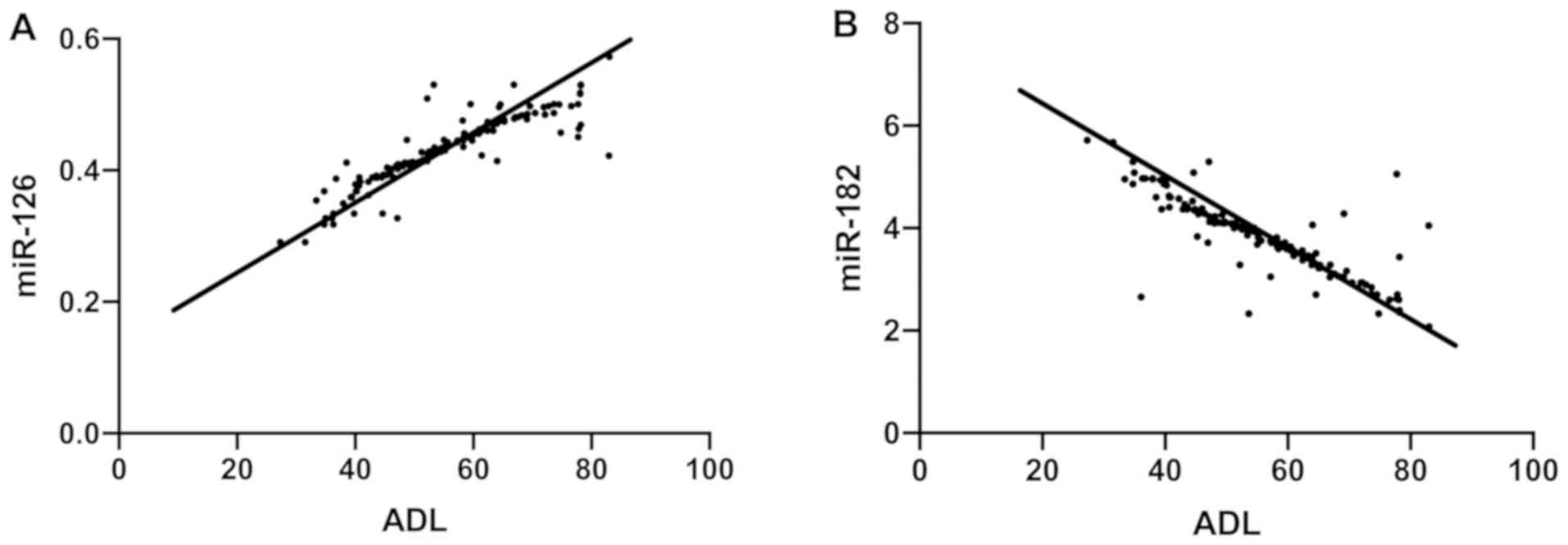 Pearson's correlation analysis suggested that in the observation group, ADL scores were positively correlated with miR-126 (r=0.8876, P<0.001) and negatively correlated with miR-182 (r=−0.8375, P<0.001) (Fig. 3).