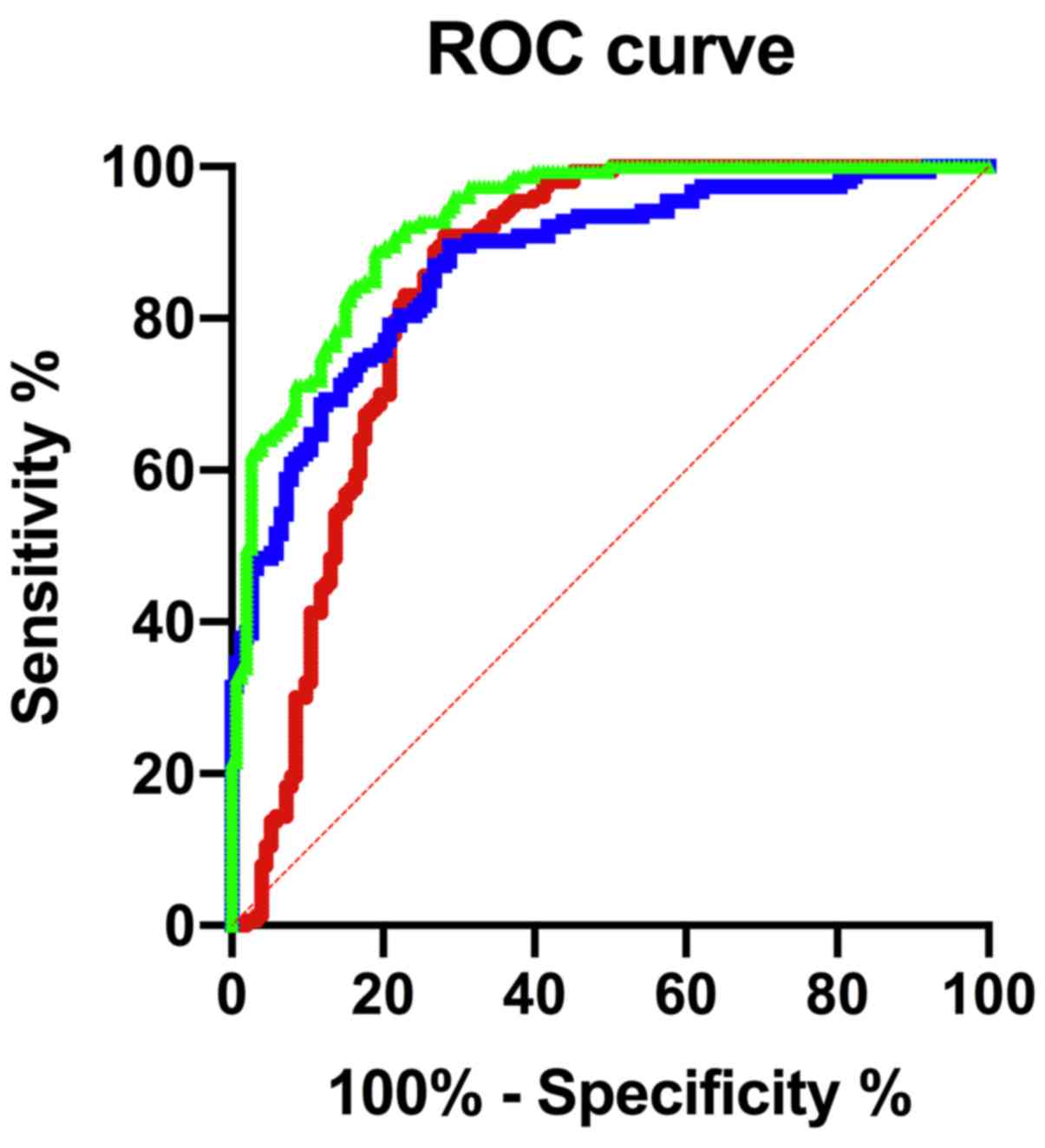 Statistical analysis of data was performed on SPSS 19.0 statistical software (Beijing NDTimes Technology Co., Ltd.). The enumeration data were analyzed by chi-square test. The measurement data were expressed as the mean ± standard deviation and compared between two groups by the independent t-test. Pearson's correlation efficient was used to analyze the correlation of miR-126 and miR-182 with NIHSS, ADL and MRS scores. ROC curve was plotted to assess the predictive value of miR-126 and miR-182, alone or in combination, for the short-term prognosis in patients with acute stroke. The experiment data were visualized by GraphPad Prism8. A statistical difference was recognized at P<0.05.