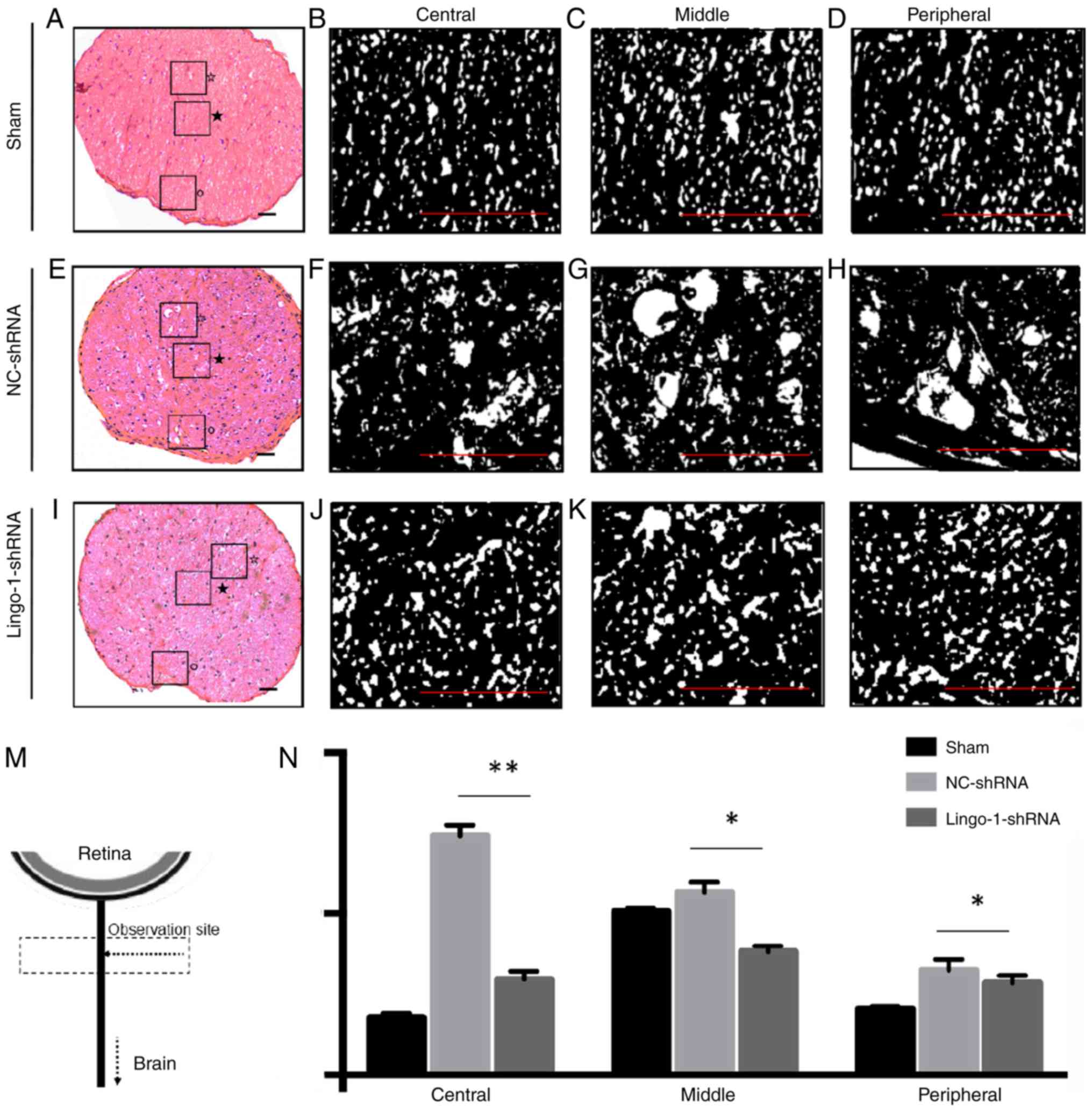 Tissue repair was estimated by calculating the size of the lesion cavities in injured ONs. The size of the lesion cavity was calculated in HE-stained sections (longitudinal and transverse ON sections) at 4 weeks post-injury to detect tissue repair (Fig. 4). The tissue did not narrow from the outer edge of the lesioned ON. The outer margins near the lesion site relatively retained structural integrity, however, multiple cavities were observed in HE staining of ONs (Fig. 4A and H). In rats treated with lingo-1-shRNA, the total cavity area in the longitudinal plane was 21.9% smaller compared with the NC-shRNA group (27930.0 pixels vs. 34034.7 pixels, respectively; P<0.05; Fig. 4C, F and J). The differences of total cavity area between the lingo-1-shRNA group and the NC-shRNA group at the retrograde and antegrade sites were insignificant (Fig. 4B, D, E, G, I and K). Differences in lesion volume were also observed in transverse sections (Fig. 5), the cavities in lingo-1-shRNA-treated rats were significantly smaller and less numerous than those in the NC-shRNA group.
