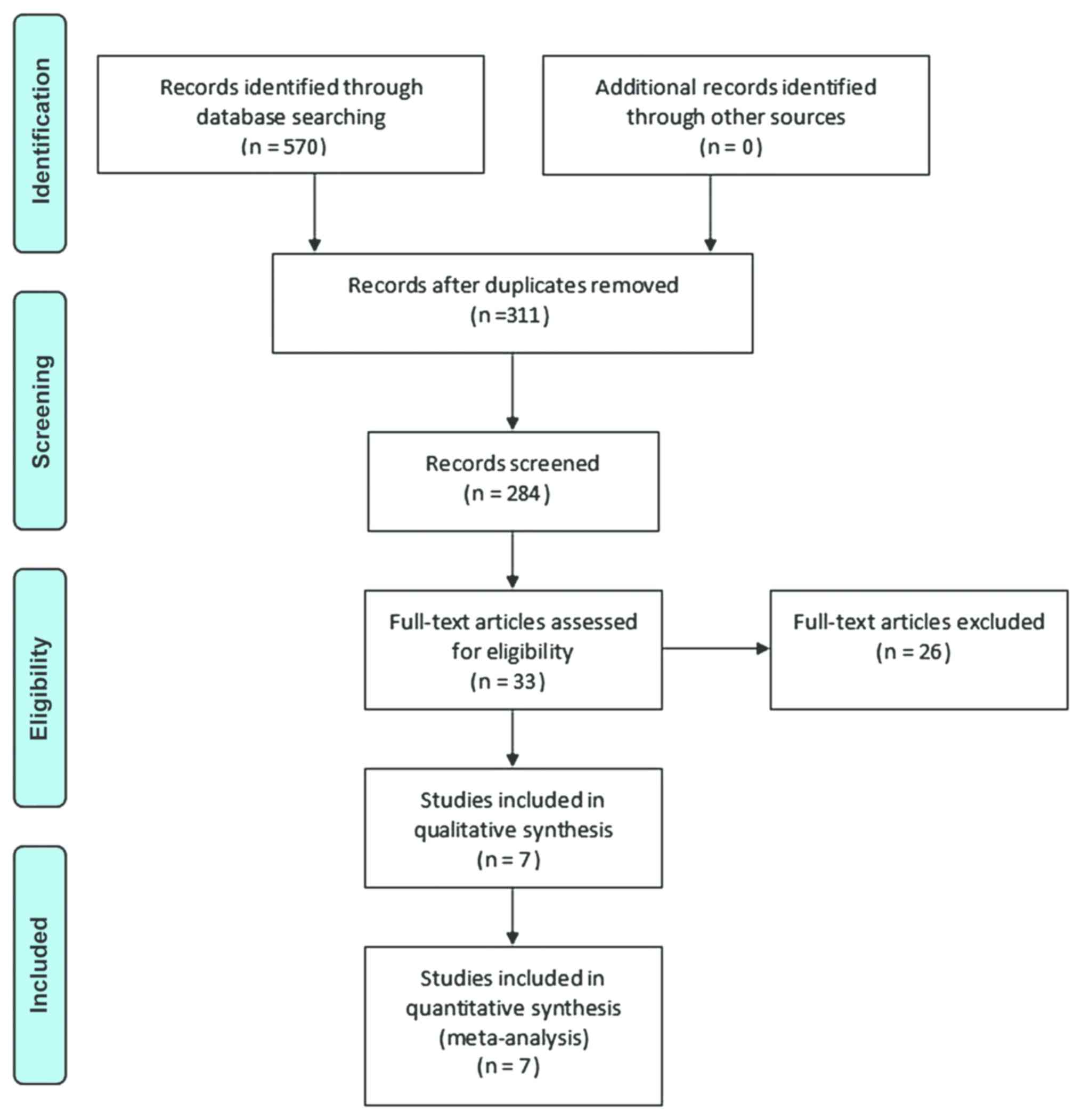 The searches identified 570 articles. Titles and abstracts were screened, 259 duplicates were excluded and 33 articles were considered eligible for inclusion. After analyzing the full-text articles, 26 studies were excluded. Among these, 6 articles reported incomplete data, 11 were on non-randomized controlled trials, 8 studies did not use lidocaine as the intervention and 1 article was a case report. Finally, 7 RCTs (8 datasets) were evaluated in the meta-analysis (Fig. 1) (20–27).
