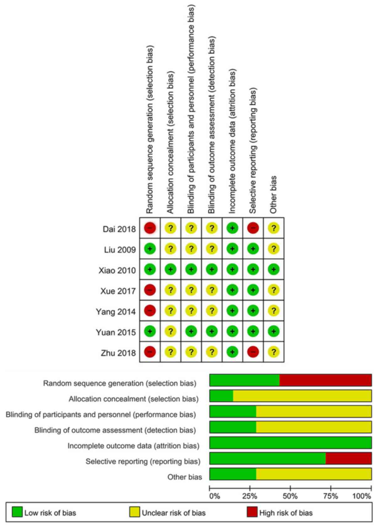 Two review authors independently assessed risk of bias in the studies included using the Cochrane Risk of Bias Tool for Randomized Controlled Trials, which evaluates the following domains: Sequence generation, allocation concealment, blinding of participants and personnel, blinding of outcome assessment, incomplete outcome data, selective reporting and other bias. In each domain, risk of bias was judged as ‘high’, ‘unclear’ or ‘low’ (18). Disagreements among review authors on assessment of study quality were resolved by discussion until consensus was reached.