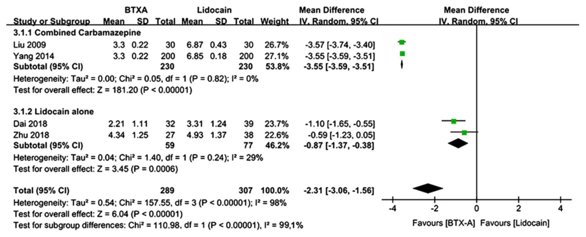 The present meta-analysis had certain limitations. First, the numbers of clinical trials and patients included were small. Furthermore, certain studies were judged as having ‘high risk’ of bias and it was not possible to assess publication bias, as an insufficient number of studies was included. In addition, there were significant differences in the baseline characteristics of the patients treated with BTX-A or lidocaine in several of the included trials, representing a potential source of heterogeneity in the present analyses. As another limitation, certain patients were administered therapies in addition to BTX-A or lidocaine, which may make it difficult to draw conclusions about several outcomes. Furthermore, there is currently no gold standard measure of treatment success for neuralgia; therefore, the present study reports on a variety of outcomes. Finally, there was evidence of heterogeneity between trials. This will likely be reduced in the future as data from more RCTs become available and a gold standard measure of treatment success is established.