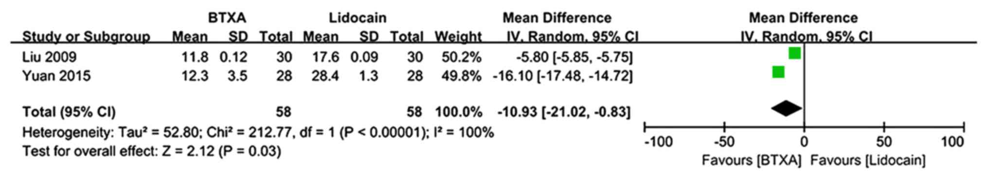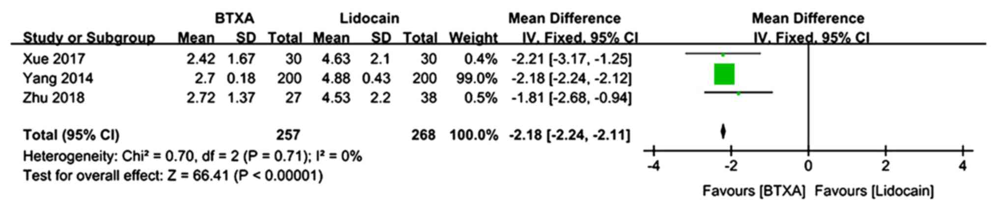The VAS pain scores at 2 months of follow-up were described in 3 trials (n=525 patients; 257 patients in the BTX-A group and 268 patients in the lidocaine group) (21,24,25). There was no evidence of heterogeneity between studies. The meta-analysis demonstrated a significantly lower VAS pain score in patients who received BTX-A for post-herpetic neuralgia compared to those who received lidocaine (MD=−2.18; 95% CI: −2.24, −2.11; P<0.00001; Fig. 4).