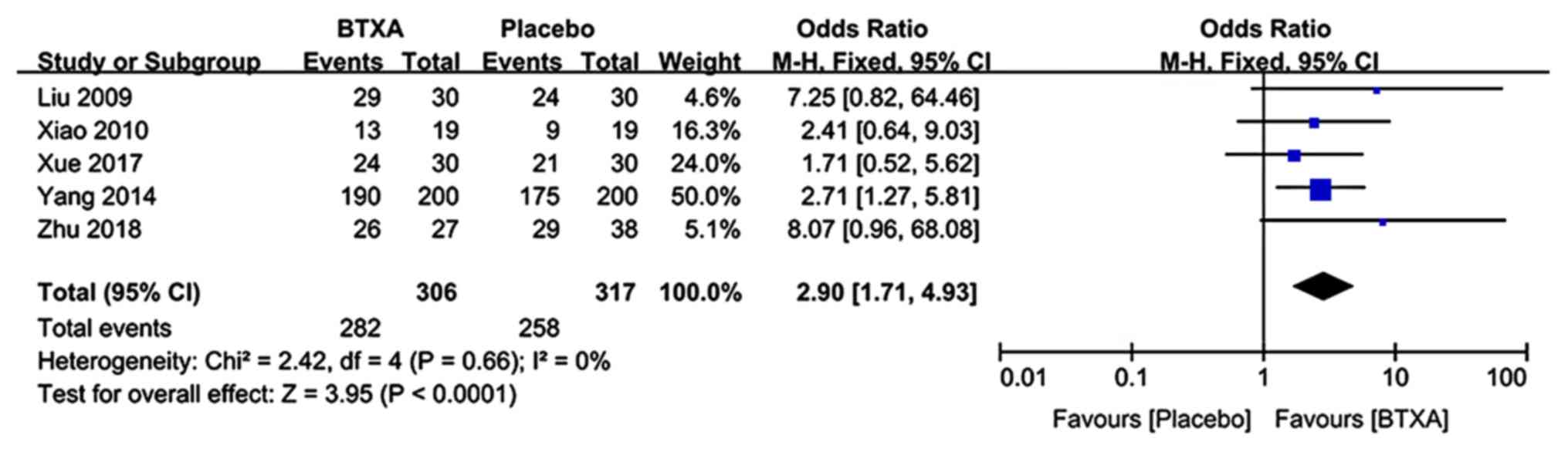 Data reporting on the effective rate were included in 5 trials (n=623 patients; 306 patients in the BTX-A group and 317 patients in the lidocaine group) (21–23,25,27). There was no evidence of heterogeneity between studies. The meta-analysis demonstrated a significantly higher effective rate in patients who received BTX-A for post-herpetic neuralgia compared to those who received lidocaine (OR: 2.9; 95% CI: 1.71, 4.13; P<0.0001; Fig. 6).