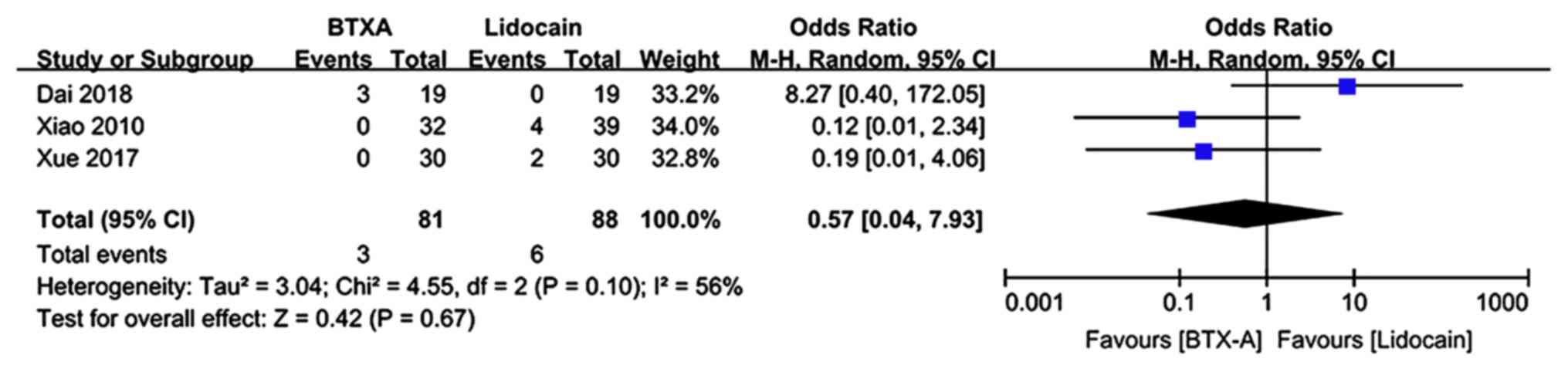 Adverse events during the follow-up period were described in 3 trials (n=169 patients; 81 patients in the BTX-A group and 88 patients in the lidocaine group). There was evidence of significant heterogeneity between studies. The meta-analysis revealed no significant difference in the adverse event rate in patients who received BTX-A for post-herpetic neuralgia compared to those who received lidocaine (OR: 0.57; 95% CI: 0.04, 7.93; P=0.67; Fig. 8).